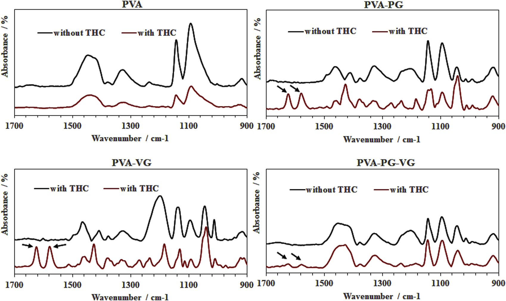 FTIR spectra confirming the presence of THC in the hydrogels. PVA, poly (vinyl alcohol); PG, propylene glycol; VG, vegetable glycerine. Arrows show THC specific picks.