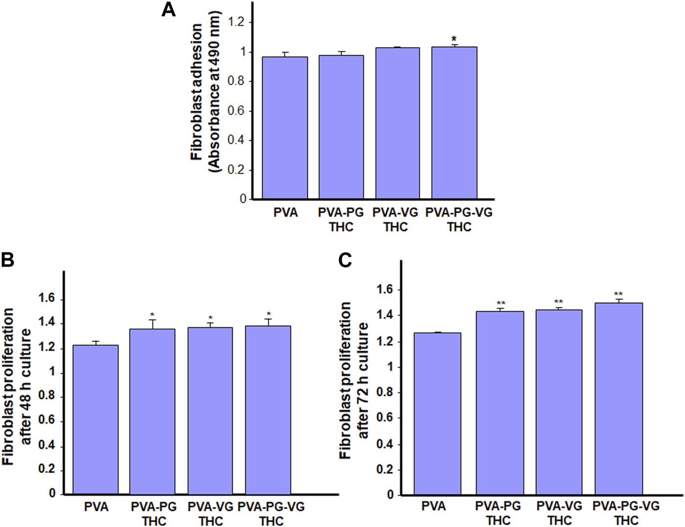 *p < 0.05; **p < 0.01; ***p < 0.001 when comparing the PVA-PG, PVA-VG, and PVA-PG-VG, to PVA., cell proliferation was evaluated by trypan blue exclusion assay.