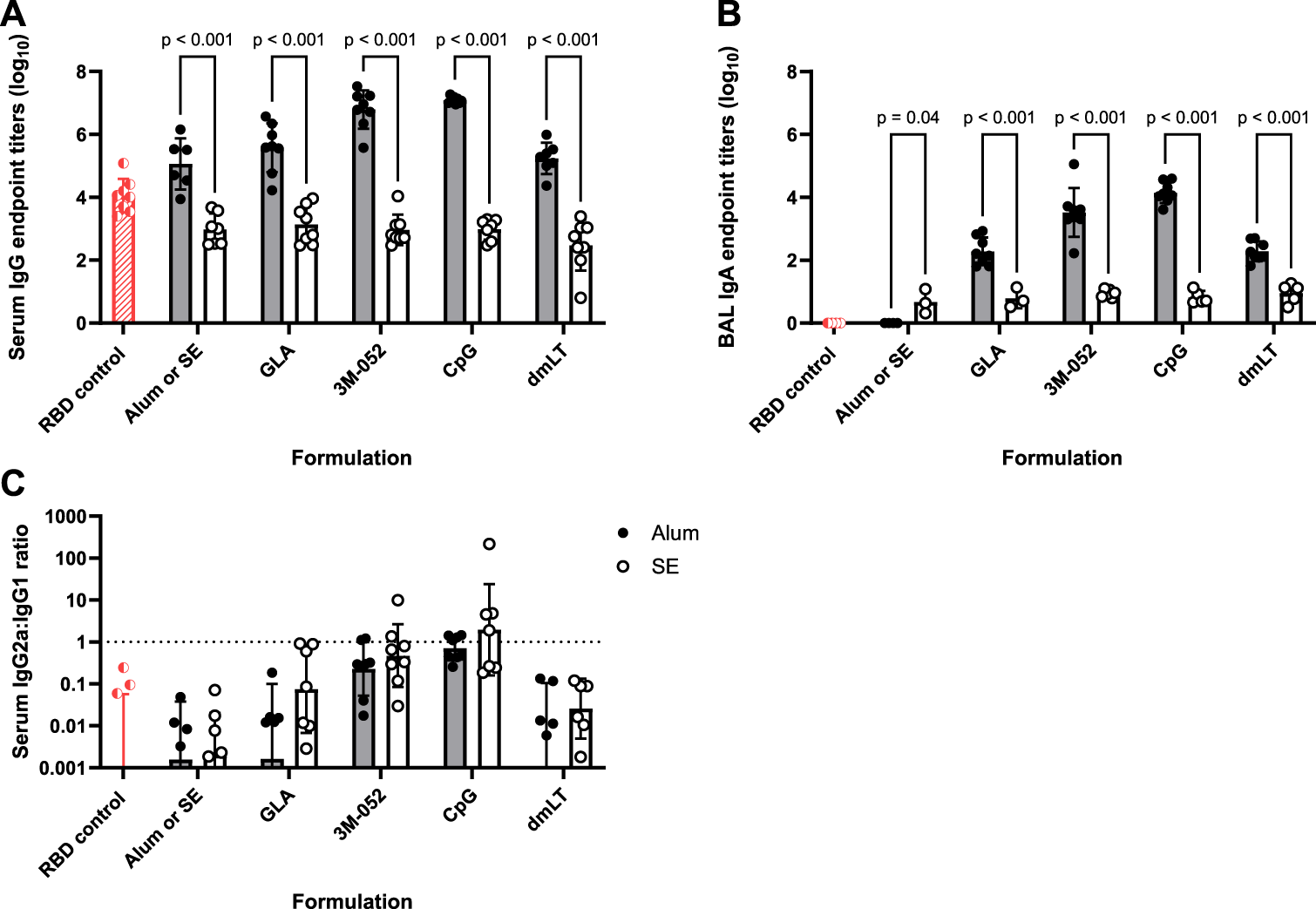 Formulation choice drives humoral response. Data collected from n = 8 (4M:4F) animals on Day 42 after being vaccinated twice intramuscularly (Day 0 and Day 21) with RBD in combination with the indicated receptor agonist formulated with either Alum or SE. RBD control data (red striped) were collected from animals who were vaccinated twice with RBD, without the addition of an adjuvant. The study was divided in half and vaccinations/harvests were staggered 1 week apart to reduce operator burden. Assays presented here were performed for all animals simultaneously using frozen serum and BAL samples. Animals in the Alum-containing groups and the RBD control group were vaccinated and harvested on different days than those in the SE-containing groups. (A) Serum titer of total anti-RBD IgG, (B) BAL titer of anti-RBD IgA, and (C) serum ratio of exponentiated anti-RBD IgG2a/IgG1 titers. (A, B) Statistical significance was determined via repeated t-tests followed by a Holm-Sidak’s correction for multiple comparisons, fixing the family-wide error rate to 0.05. Horizontal bars represent the mean ± SD of log-normalized data. (C) Statistical significance was determined via multiple non-parametric Mann-Whitney tests followed by Holm-Sidak’s correction for multiple comparisons, fixing the family-wide error rate to 0.05. Horizontal bars represent the geometric mean ± geometric SD.