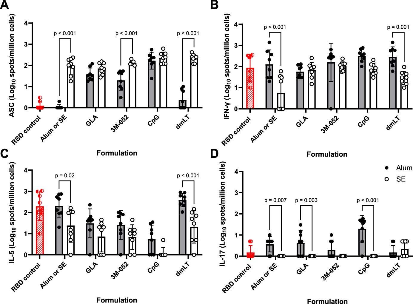 Formulation choice affects immune phenotype. ELISpot data collected from n = 8 (4M:4F) animals on Day 42 after being vaccinated twice intramuscularly (Day 0 and Day 21) with RBD in combination with the indicated Alum- or SE-formulated receptor agonist. RBD control data (red striped) were collected from animals who were vaccinated twice with RBD without the addition of an adjuvant. Study groups were divided in half and vaccinations/harvests were staggered 1 week apart to reduce operator burden. Assays presented here were performed at the time of tissue harvest. Animals in the Alum-containing groups and the RBD control group were vaccinated and harvested on different days than those in the SE-containing groups. (A) Bone marrow-derived anti-full-length-wt-spike IgG antibody-secreting cells (ASC) ELISpot. T cell ELISpot measurement of splenocytes secreting (B) IFN-γ, (C) IL-5, or (D) IL-17 upon re-stimulation with a SARS-CoV-2 peptide pool. Horizontal bars represent the mean ± SD of the log-transformed data. Statistical significance was determined via two-way ANOVA followed by Holm-Sidak’s correction for multiple comparisons.