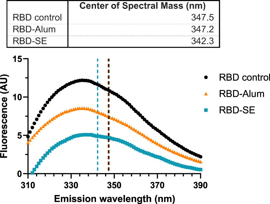 Formulation with SE causes a blue shift in fluorescence spectra. Data are representative of the average of three replicate measurements after applying a Savitzky-Golay filter to reduce signal noise. Samples were excited at 295 nm, and emissions were read between 310 and 450 nm (only 310–390 nm shown). Centers of spectral mass were determined for each formulation and are indicated by the corresponding dashed lines. Statistically significant differences between distributions were determined via multiple Kolmogorov–Smirnov tests, followed by Holm-Sidak’s correction for multiple comparisons (RBD vs. RBD-Alum: p = 1. RBD vs. RBD-SE: p < 0.001. RBD-SE vs. RBD-Alum: p < 0.001).