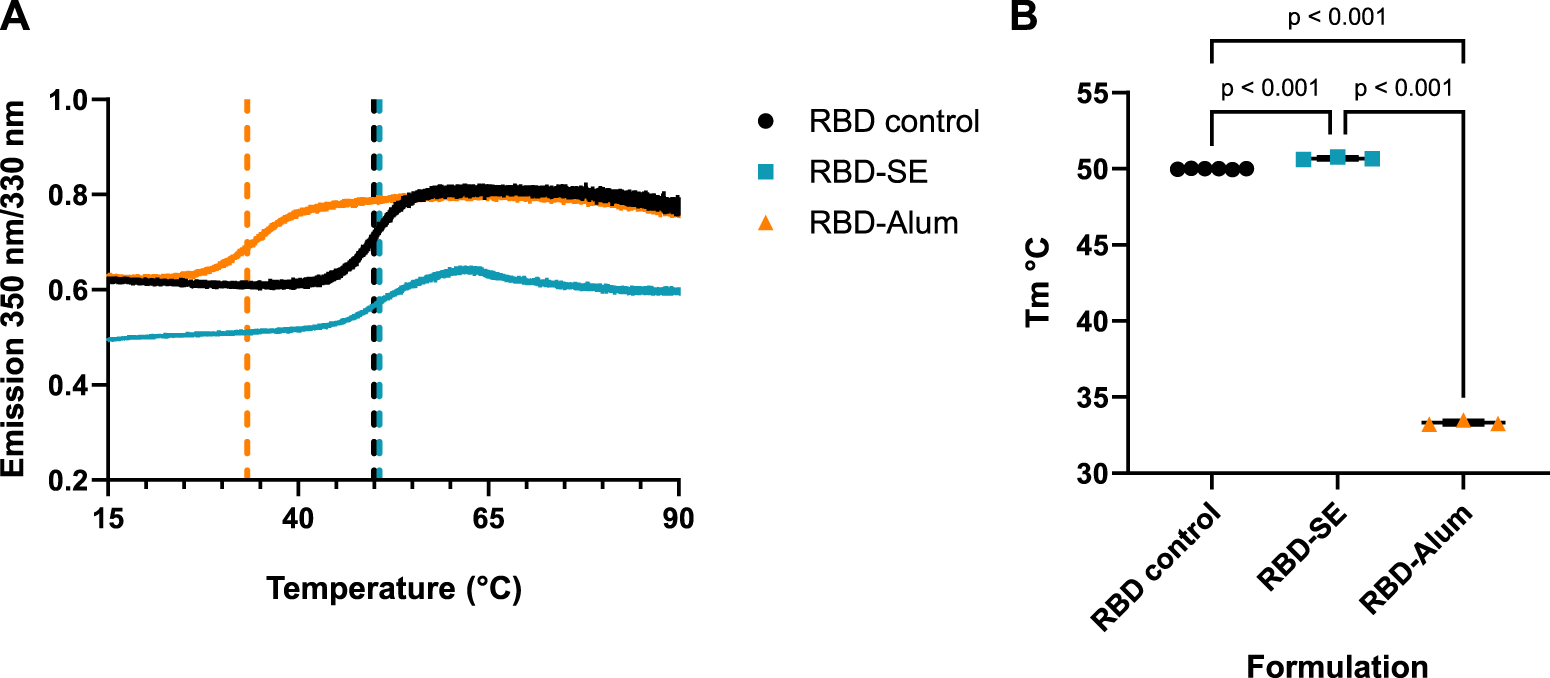 Differences in formulated RBD melting temperature (Tm), also an assessment of protein conformation, were measured via differential scanning fluorimetry (DSF). The initial (i.e., low temperature) 350:330 emission ratio measured for each formulation was consistent with the center of spectral mass values in Figure 4 with a similar ratio for the RBD control and RBD-Alum and a lower ratio for the RBD-SE, indicating a more hydrophobic environment for the tryptophan residues in the RBD-SE formulation. Formulation with both SE and Alum caused statistically significant shifts from the native RBD Tm of 49.99 °C (Figure 5), suggesting an impact on the antigen’s conformation in both cases. Formulation with SE increased the Tm by 0.70°C–50.69°C (p < 0.001), and formulation with Alum decreased the Tm by 16.66°C–33.33°C (p < 0.001). Our immunology readouts demonstrate that the Alum-containing formulations maintained their immunogenicity effectively, but the decreased Tm may indicate a loss of long-term stability for the RBD antigen formulated with Alum. This further suggests that formulation with either SE or Alum led to distinct changes in the structure of the RBD antigen, at both ambient and elevated temperatures.