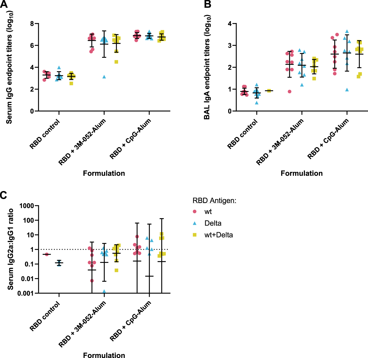 Readouts for serum anti-wt RBD IgG (Figure 6A), BAL wash anti-wt RBD IgA (Figure 6B), and serum anti-wt RBD IgG2a/IgG1 ratio (Figure 6C) showed no significant differences between antigen groups (p > 0.34 for all comparisons). The choice of adjuvant was found to be the only statistically significant source of variation (p < 0.001 in all cases via two-way ANOVA).