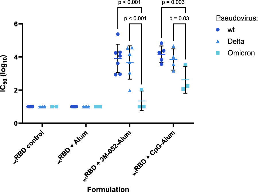 SARS-CoV-2 wt (Wuhan), Delta (B.1.617.2), or Omicron (B.1.1.529) strain neutralizing titers of vaccinated mouse sera were quantified using established in vitro SARS-CoV-2 variant spike protein-expressing lentiviral pseudovirus neutralization assays (Rice et al., 2022; Voigt et al., 2022). The neutralizing IC50 of serum from animals that had received the wt RBD vaccine antigen either unadjuvanted or formulated with Alum, 3M-052-Alum, or CpG-Alum were thus measured. None of the animals that received the unadjuvanted wt RBD or the wt RBD formulated on Alum without an additional agonist displayed a serum-neutralizing IC50 value above our limit of detection against any of the three tested SARS-CoV-2 variants (Figure 7). There was no significant difference in serum IC50 against the wt or Delta variant pseudoviruses from mice that received the wt RBD adjuvanted with either 3M-052-Alum (p = 0.44) or CpG-Alum (p = 0.43). The mean serum virus neutralizing IC50 response from the adjuvanted wt RBD groups against the Omicron variant pseudovirus was significantly lower than the responses against the wt or Delta pseudovirus by about 2 logs for animals vaccinated with wt RBD formulated with 3M-052-Alum (p < 0.001 for both comparisons), and by about 1 log for animals vaccinated with wt RBD formulated with CpG-Alum (p < 0.02 for both comparisons).