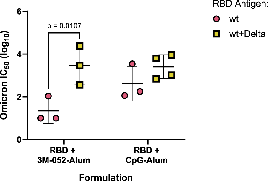 To understand the effect of bivalency on neutralization against an Omicron variant (B.1.1.529) pseudovirus, we compared the serum-neutralizing IC50 of mice that had received either only the wt RBD or both the wt and the Delta RBDs, formulated with either 3M-052-Alum or CpG-Alum. Vaccination with the bivalent wt + Delta RBD antigens significantly increased the Omicron strain neutralizing IC50 of mice that had received the 3M-052-Alum adjuvanted vaccine by 2.12 logs (p = 0.0107) but did not significantly improve the neutralizing IC50 of mice that had received the CpG-Alum adjuvanted vaccine (p = 0.333) despite a mean increase of 0.79 logs (Figure 8). This suggests that there was a degree of response broadening with the bivalent RBD antigen formulated with 3M-052-Alum, but the strength of the CpG-Alum adjuvanted wt RBD was strong enough against the Omicron pseudovirus that no significant difference was detected compared to the bivalent antigen.