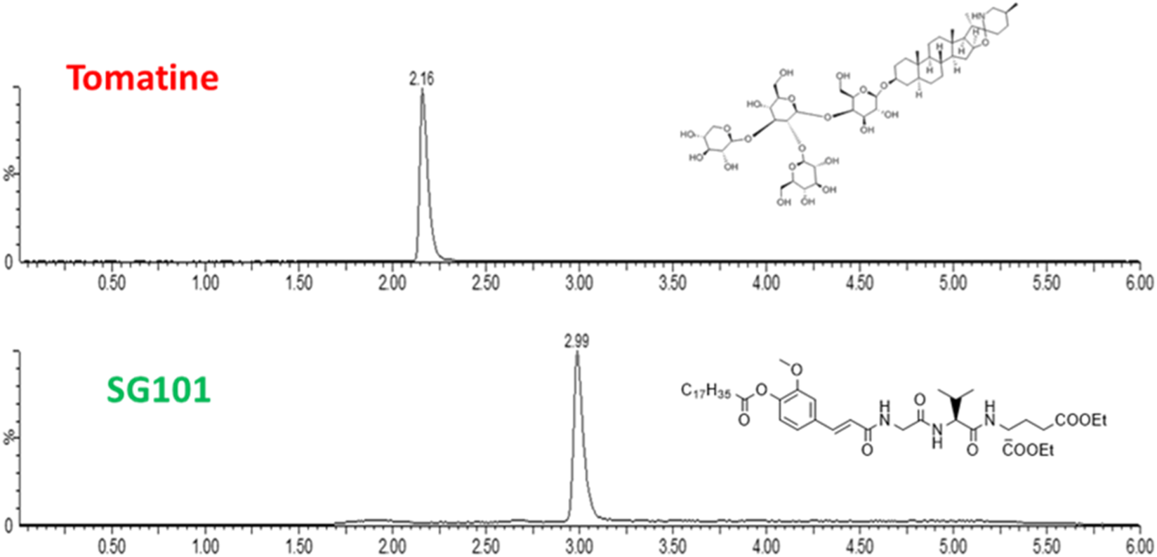 Chromatograms of tomatine and SG101 after LC-MS (ESI+) separation and acquisition. The X-axis represents time of retention, and y-axis, % of intensity. Quantification performed through peak integration.