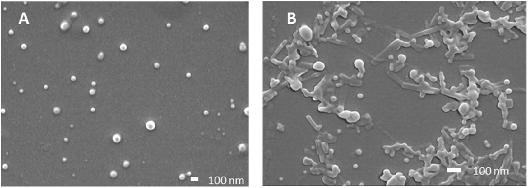 Scanning electron microscopy images of PLGA-Chol samples. (A) Formulation A; (B) formulation (B). All samples were resuspended in MilliQ water before drying under vacuum. Scale bar is at 100 nm.