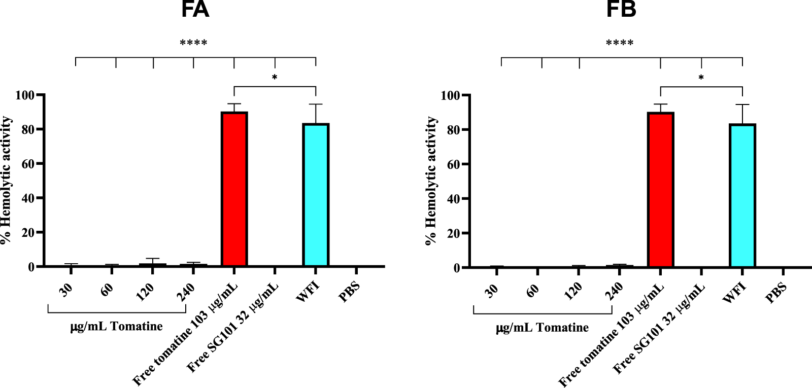 Hemolytic activity of defibrinated sheep red blood cells after incubation with formulation A (blue) and formulation B (green) at various concentrations of tomatine. Un-encapsulated tomatine at a concentration of 103 μg/mL and WFI were used as positive controls. SG101 at a concentration of 32 μg/mL and cells treated with PBS were used as negative controls. Tomatine 103.4 μg/mL corresponds to the minimum dose at which the free drug is 100% hemolytic (Supplementary Figure S2). SG101 32 μg/mL corresponds to the average concentration found of SG101 in the particles for the same amount of tomatine tested as control. Data are represented as mean ± SD (n = 3). **** indicates p < 0.0001, and * indicates p < 0.05 when comparing the WFI group with other groups. Tomatine has higher hemolytic activity than WFI. Here, 100% of hemolytic activity is considered (OD (sample)-OD (negative control)/OD (positive control)), considering that OD average values of negative control (untreated cells) are 0.173 ± 0.009 and those of positive control (WFI) are 1,568 ± 0.102.