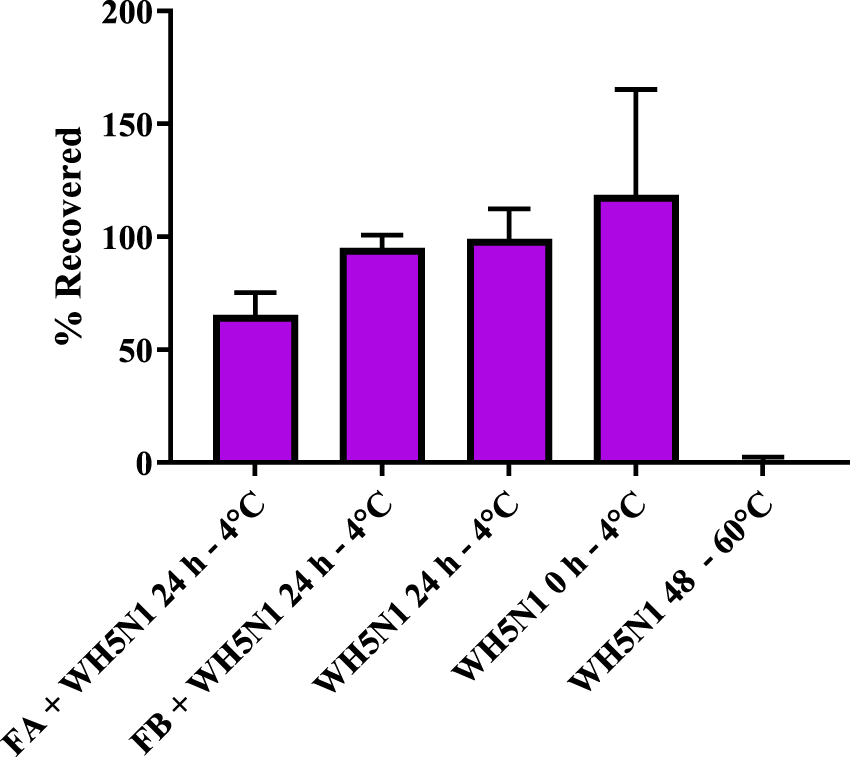 Antigen stability (WH5N1- 1.5 µg) after incubation with formulations A (33 mg) and B (19 mg) at the in vivo dose in 100 µL of PBS for 24 h. WH5N1 antigen, 1.5 µg, incubated for 48 h at 60 °C was used as the positive control. An amount of 1.5 µg WH5N1 incubated in PBS for 24 h and fresh antigen were used as negative control. Data are represented as mean ± SD (n = 3). Here, 100% is determined as 1.5 µg WH5N1 recovered after assay.