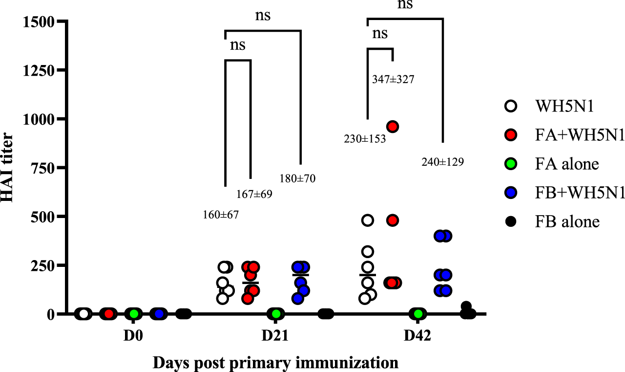 Antigen-specific antibodies measured by HA inhibition assay in C57BL/6 mice after a prime and boost i.m. injection of adjuvanted vaccine at days 0 and 21. WH5N1 was injected at a dose of 1.5 µg per 50 μL in combination with PLGA-Chol FA formulation or with FB formulation (both containing tomatine and SG101). Both FA and FB were also injected i.m. with PBS as adjuvant-only controls. Mouse sera were recovered at days 0, 21, and 42. Results are presented as individual mouse titer (circle) and as mean (bar) (n = 6). HA inhibition assay was repeated twice. Two-way ANOVA with multiple comparison was used for statistical analysis. ‘Ns’ indicates no statistical difference.