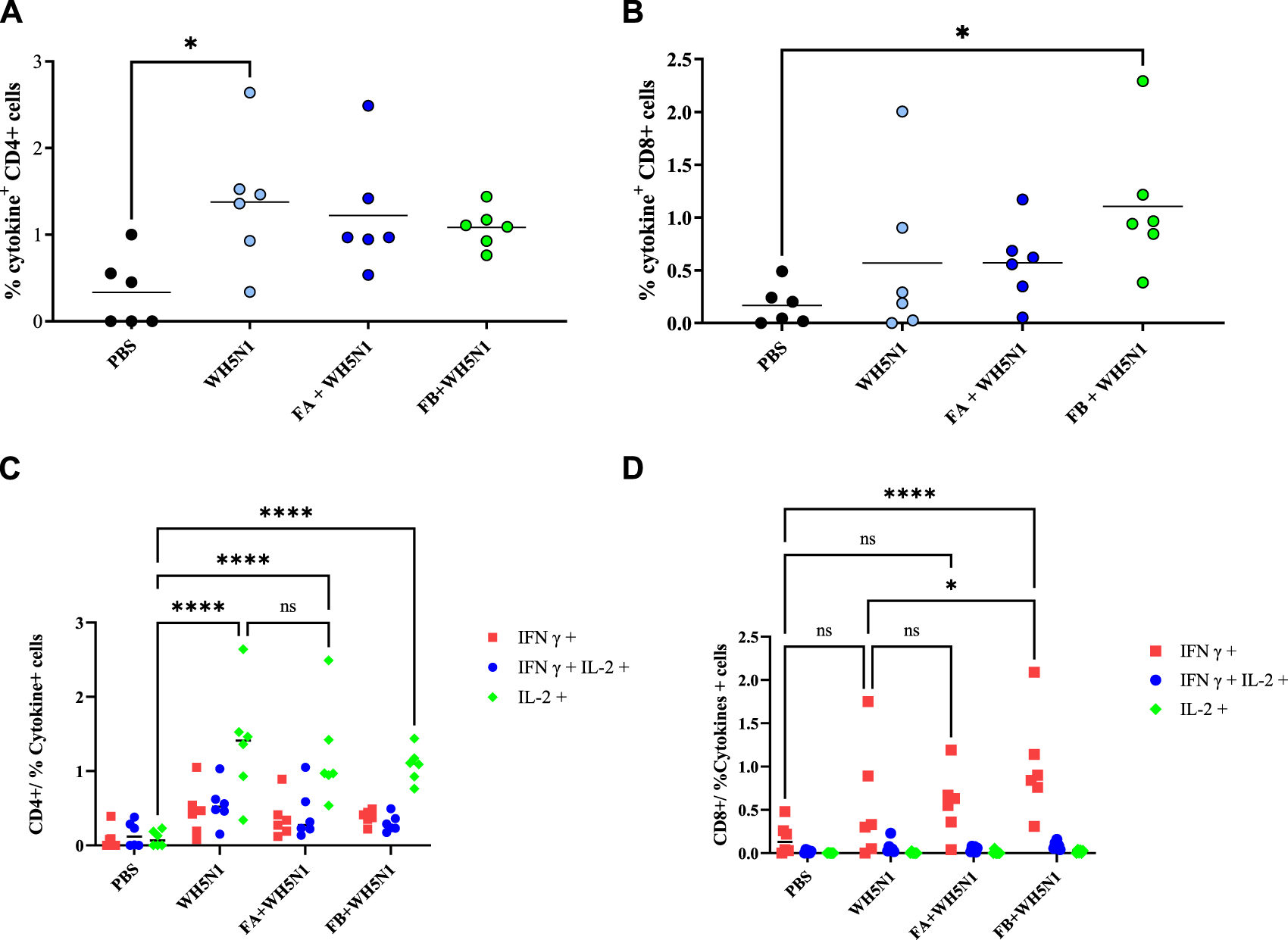 Antigen-specific T-cell responses induced by PBS, WH5N1, adjuvanted WH5N1 with FA, and WH5N1 plus FB, after antigen boost 1 week before sacrifice. Splenocytes were collected and stained to quantify by FACS CD4, CD8, and intracellular cytokines IL-2 and IFNγ secreted within the cells. (A) Total CD4 + T cells positive to cytokine secretion; (B) total CD8 + T cells positive to cytokine secretion; (C) CD4 + T cells positive to IFNγ, IL-2, or both cytokines after signal subtraction with unstimulated cells; (D) CD8 + T cells positive to cytokines, after signal subtraction with un-stimulated cells. Each dot corresponds to an individual mouse (N = 6); mean is presented for every group. Two-way ANOVA with multiple comparison was used for statistical analysis. Ns show no presence of statistical difference. **** indicates p < 0.0001; * indicates p < 0.05; ns indicates no presence of statistical significance.