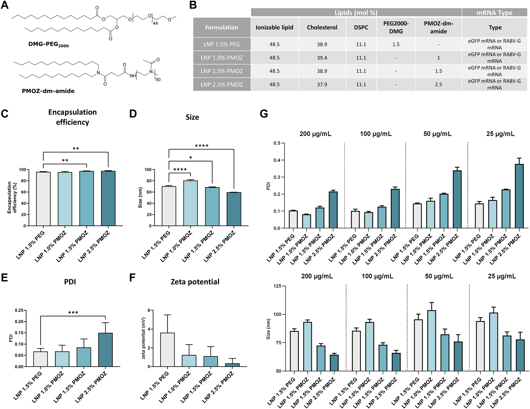 Physicochemical characteristics of LNPs formulated with various percentages of PMOZ. (A) Chemical structure of PEG2000-DMG and PMOZ-DM-amide. (B) Composition of mRNA-LNPs that contain different polymer-lipid percentages. Formulation was performed with either unmodified eGFP mRNA or m1Ψ-modified RABV-G mRNA. (C) Encapsulation efficiency (%) of mRNA. (D–F) DLS analysis of hydrodynamic size (D), PDI (E) and zeta potential (F). Triplicate measurements were performed for LNPs that encapsulate unmodified eGFP mRNA or m1Ψ-modified RABV-G mRNA and bars represent mean values. (G) RABV-G mRNA-LNPs were frozen at various concentrations and PDI (top panel) and hydrodynamic size (bottom panel) analyzed upon thawing. Triplicate measurements are shown and bars represent mean values. Statistical analysis was performed with a one-way ANOVA with Tukey’s multiple comparison test. *p < 0.1, **p < 0.01, ***p < 0.001, ****p < 0.0001.