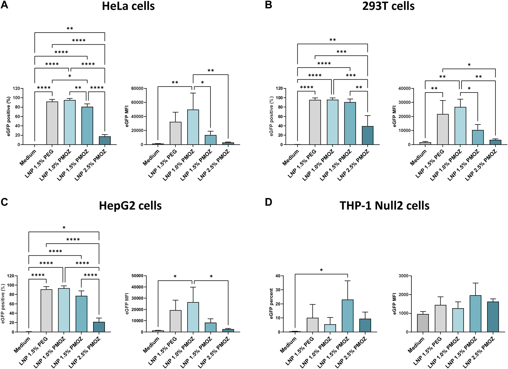 We next assessed the performance of PMOZ-containing LNPs in various cell lines. To this end, HeLa, 293T, HepG2 and THP-1 Null2 cells were treated with LNPs that encapsulate unmodified eGFP mRNA. The resulting cells were analyzed by flow cytometry to quantify the percentage eGFP-positive cells and the eGFP median fluorescence intensity (MFI) (Figure 2; Supplementary Figure S1). This revealed that a lower percentage of PMOZ correlated with an increase in transfection in HeLa, 293T and HepG2 cells. Moreover, LNP 1.0% PMOZ (for LNP nomenclature see Figure 1B) transfected these cell lines to a similar degree as LNP 1.5% PEG. This trend was not observed in the monocytic cell lines THP-1 Null2 and LNP 1.5% PMOZ more readily transfected cells in comparison to all other LNPs. However, this trend is not statistically significant. These results strongly suggest that LNPs can be formulated with PMOZ to successfully deliver mRNA to cell lines.