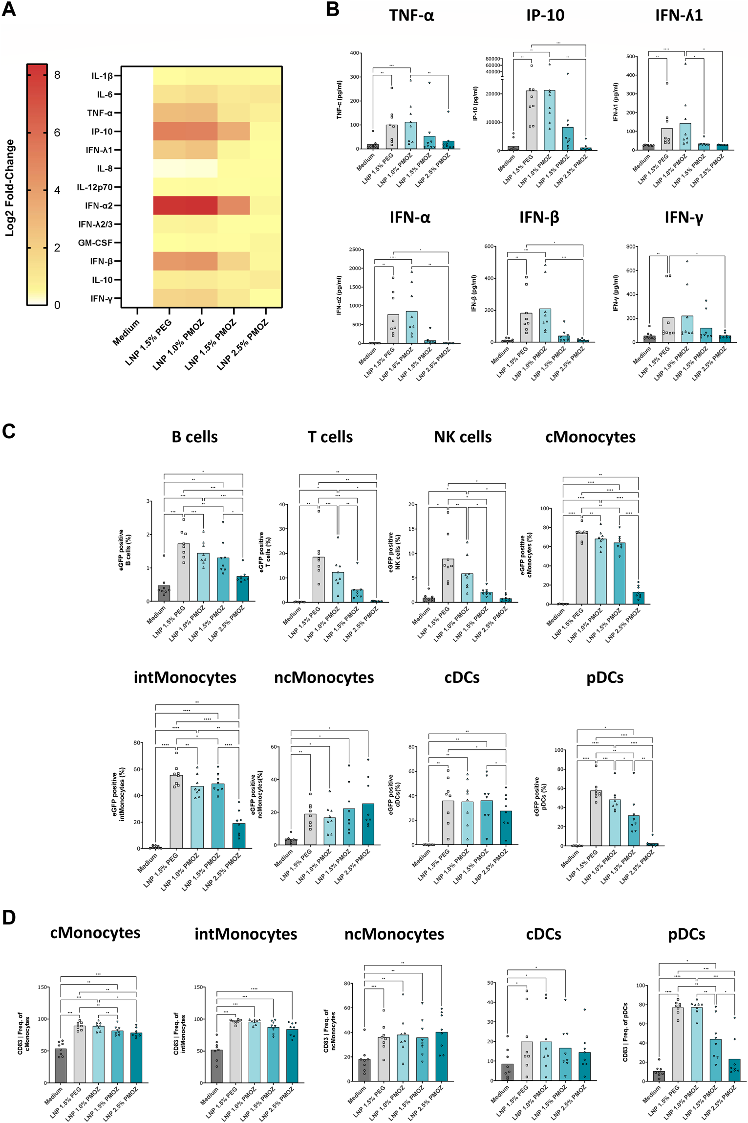 Analysis of eGFP mRNA-LNPs that comprise different percentages of PMOZ ex vivo. PBMCs from 8 donors were treated with LNPs at 500 ng/mL or medium control for 18 h. (A) Heatmap of Log2-transformed fold-change values (relative to medium) for various chemokines and cytokines. (B) Quantification data are shown for selected chemokine and cytokines. (C) The degree of transfection was determined in various immune cell populations using flow cytometry. The percentage of eGFP-positive cells was determined. (D) Activated innate immune cells were identified through increased CD83 surface expression. Percentages are given and bars represent the mean of 8 donors. Statistical analysis was performed with a Brown-Forsythe and Welch ANOVA with Dunnett’s T3 multiple comparison test. *p < 0.1, **p < 0.01, ***p < 0.001, ****p < 0.0001.