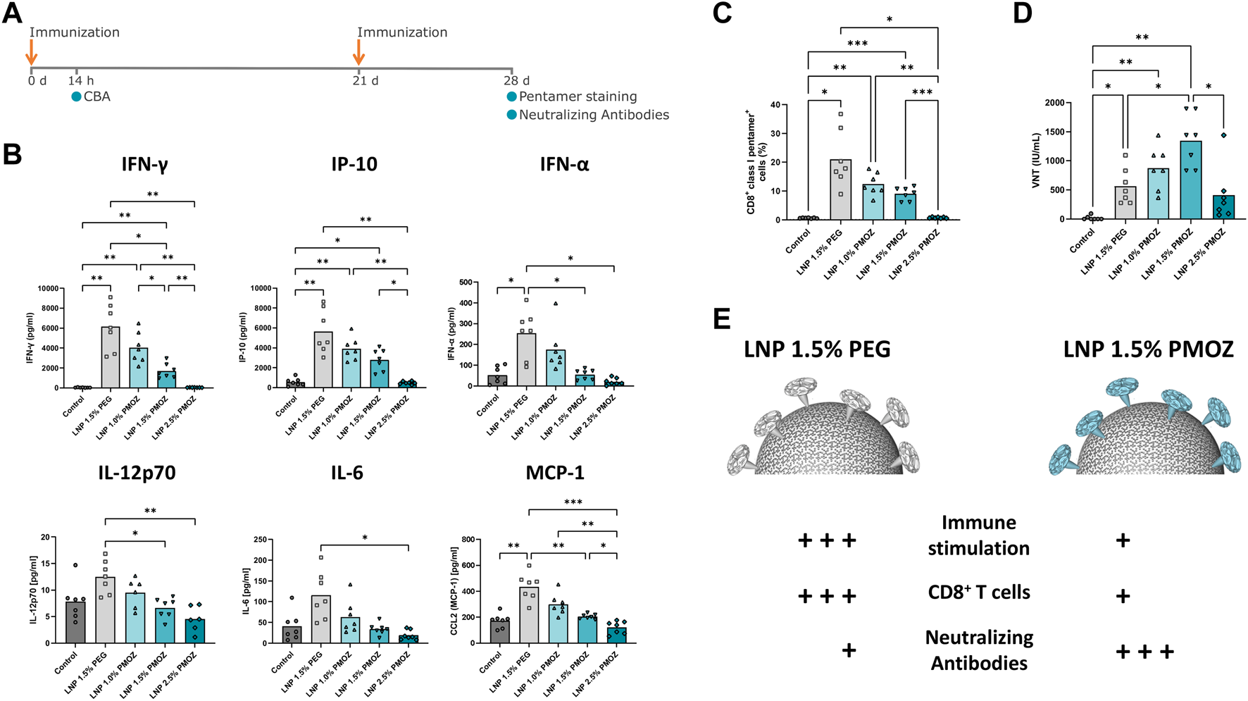 Vaccination of mice with LNPs that contain mRNA encoding the Rabies virus glycoprotein (RABV-G). (A) Mice were injected (I) m. with 1 µg of RABV-G mRNA-LNPs at days 0 and 21. The immunization schedule is displayed along with the various tests that were performed. (B) Cytokine levels in the sera of animals were quantified using a cytokine bead array. (C) Antigen specific CD8+ T-cell responses in spleens sampled on day 28. Splenocytes were stained with CD8-specific antibody and RABV-G class I pentamer to identify CD8+ class I pentamer+ cells. (D) Virus neutralization titers (VNTs) were quantified in sera from day 28. Statistical analysis was performed with a Brown-Forsythe and Welch ANOVA with Dunnett’s T3 multiple comparison test. Bars represent the mean of 7 animals. *p < 0.1, **p < 0.01, ***p < 0.001, ****p < 0.0001. (E) Differential immune responses are induced by PEG and PMOZ LNP.s.