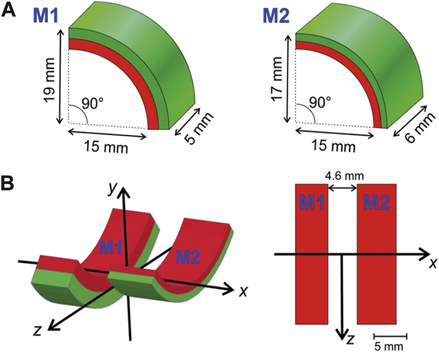 Magnets. (A) The magnetic applicator consists of two radially magnetized permanent magnet quarter-hollow cylinders (arcs) of slightly different geometry. One arc (M1) is thicker (5 mm vs. 2 mm) but shorter than the other (M2). (B) Both arcs are arranged with a gap of 4.6 mm between them. The left graph shows the coordinate system used in a 3D view, while the right is a projection of the arrangement from the top of the y-axis. The device is mounted dorsally (i.e., on the back of a mouse) such that the positive y-axis points ventrally (towards the abdomen) and the x-axis points parallel to the spinal cord.