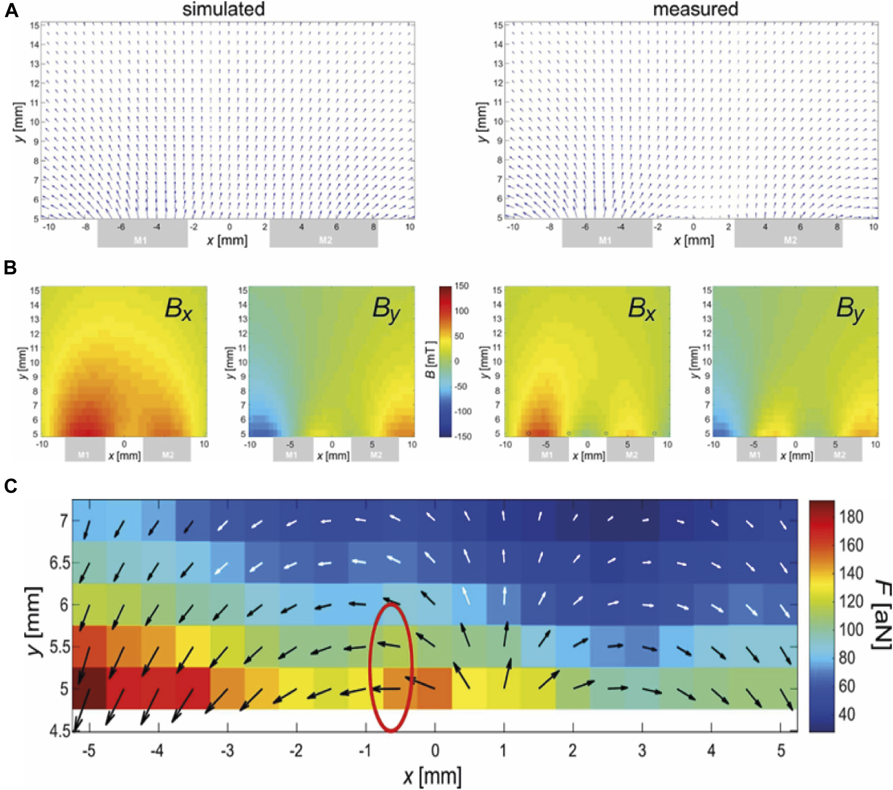 This magnet arrangement was chosen based on simulated (COMSOL Multiphysics, version 6.1) field data. The real arrangement was measured using a 3D Hall-probe (TLV493D, Infineon) positioned via a home-built 3D-stage. The results of the finite-element simulations (FEM) and the measurement are compared in Figures 2A, B. The agreement is reasonable considering easy misplacements of magnets and sensors at such small scales additional to the general variations (typically in the percent range) of the properties of permanent magnet materials.