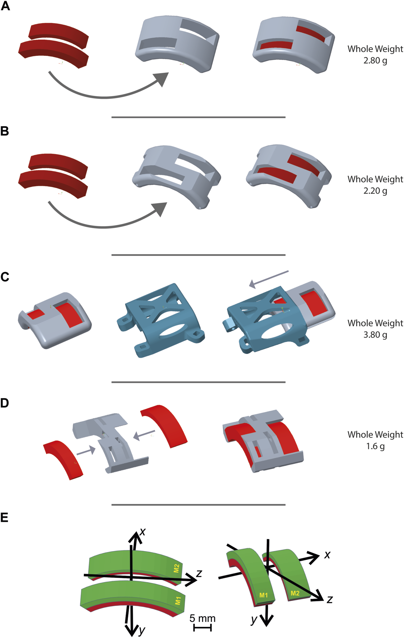Magnet holder designs. Figure 3 shows representative images generated with PTC Creo Parametric 8.0 -PTC software of different magnet holder configurations. Through an iterative design process, the MH evolved over time to be optimized according to the requirements established for the design. (A) First MH design presented two holes for the two magnets, designed to facilitate their insertion, while also reducing the device weight. (B) Second MH design based on the previous one but with two main modifications: a cut of the superior surface to render the entire structure lighter, and the second on the short sides to be associable with the second design iteration. (C) Third MH design: in order to accomplish the requirement of inverting the direction of the magnet, this third design was composed of a stable element, the slide, and a removable and invertible MH. The slide was designed as lightly as possible and with a hookup necessary to secure it into the third design iteration. (D) Fourth MH design fulfills the lightness requirement much better. The two long sides were eliminated and the addition of more holes on the superior surface made this MH the lightest compared to those previously shown. This design required the use of cyanoacrylate glue to ensure a stable fixation of the magnets in their slots. This fourth MH was designed for its use in the design iteration n. 4. (E) Coordinate systems and magnet positions for (A, B) on the left and (C, D) on the right.