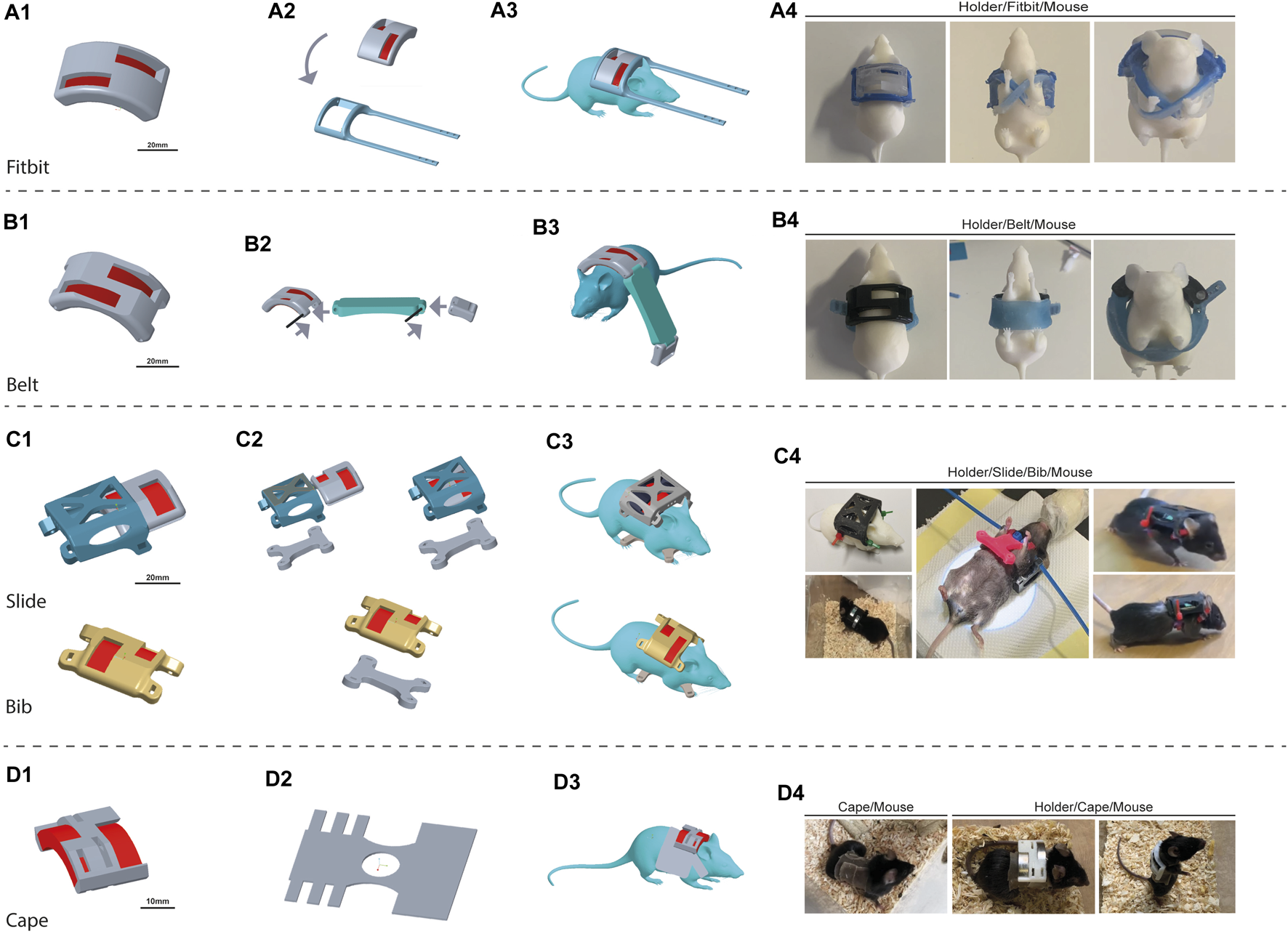 Design iterations. The device is composed of the 3D-printed magnet holder (MH) and the wearable structures, generated in silicone. We faced challenges in each step, and thus, we proposed different solutions to overcome the issues gradually encountered. The proposed configuration includes different approaches: “Fitbit” (A), “Belt” (B), “Bib” (C), and ultimately “Cape” (D). The “Bib” presented two variations: “Slide Bib” and “Simple Bib”. For each design is shown the 3D render image of the project of the magnet holder (1), of the complete wearable structure with the silicone component (2), and of the mice wearing the device. Four pictures show the real and produced devices. For “Fibit” and “Belt,” a 3D printed mouse was dressed to give an example of the wearability. No pictures are available on real mice because, after dressing, they almost immediately did not keep the device on. For the “Slide”, “Bib” and “Cape”, a picture of the wearability on real mice is shown.
