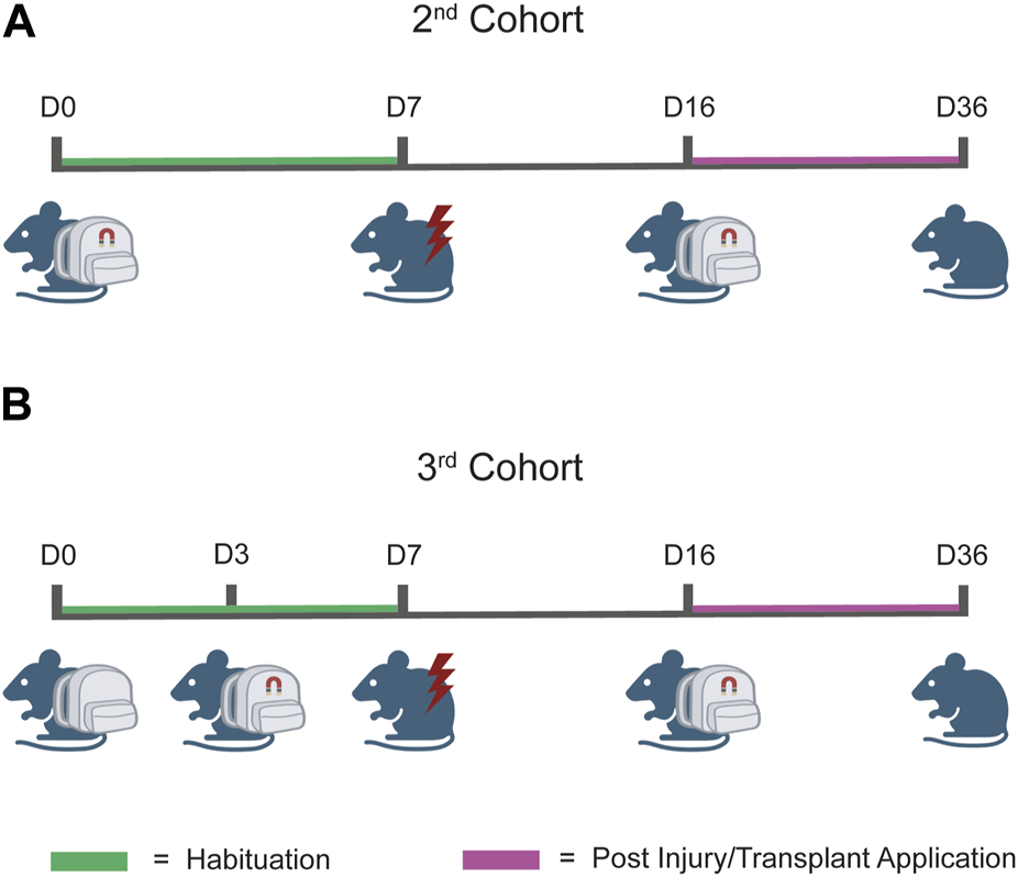 Workflow of the testing protocol. (A) Testing protocol for the second cohort. The prototype was composed of the wearable device and magnets which together were applied at day 0 (D0) and maintained until D7, coherently with the designated habituation phase. At D7, the injury was performed, and at D14, cells were transplanted. After 2 days of recovery (D16), prototypes were reapplied to the injured animal to induce magnetic stimulation. (B) Testing protocol for the third cohort. The protocol workflow is identical to that illustrated in (A) for the second cohort, except for the application time-point of the magnets. In this case, we applied the wearable device at D0 and the magnets were applied at D3. This “split habituation” was established to allow the mice to gradually familiarize with all the components of the applied prototypes.