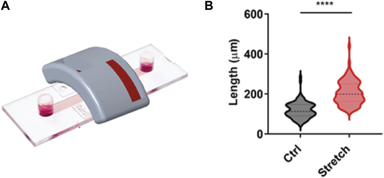 Validation of magnet configuration. (A) IBIDI two-well chamber mimicking the distance and orientation of the spinal cord in an in vivo context. This configuration was employed for in vitro validation of the magnetic support. (B) Blind analysis of the axonal length of mouse hippocampal neurons in the setup shown in (A). Violin plot from minimum to maximum, n = 100 from four replicates. Mann–Whitney test, p < 0.0001.