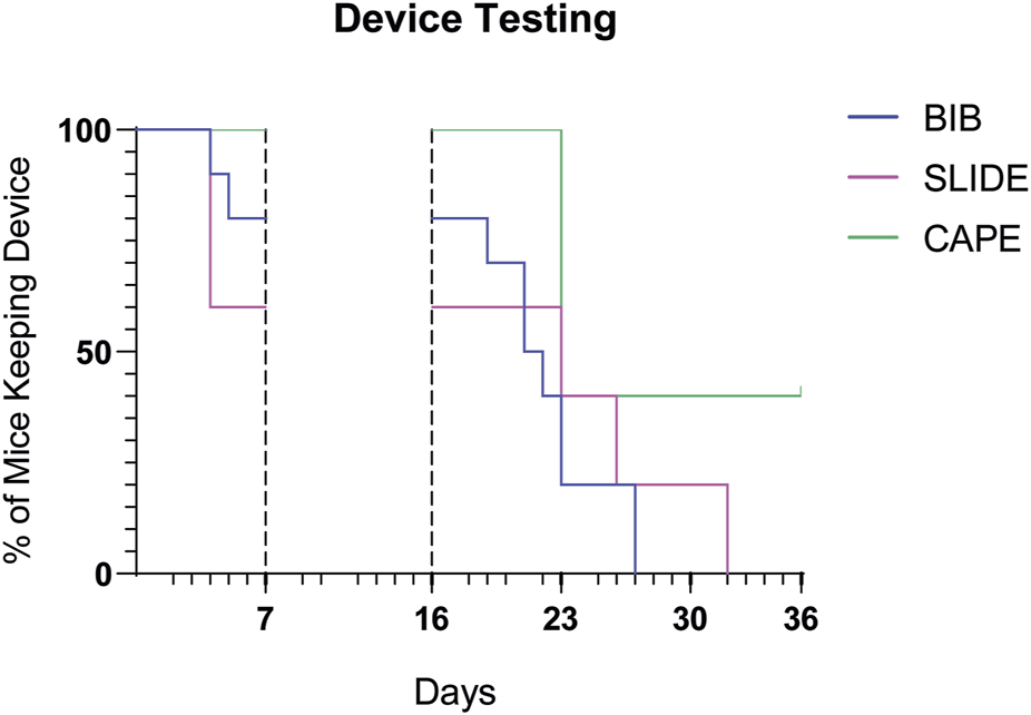 For the last trial (third cohort trial with the Cape design), the habituation period was further improved. For the first 72 h, the mice were gradually introduced to the Cape without the imposition of additional stress from magnet weights. Subsequently, the magnets were inserted into the device (without the need for additional anesthesia) and the mice spent an additional 96 h with the MH mounted. Only after this period of familiarization mice underwent the injury step. This sequence allowed them to gradually habituate to the device, thus minimizing stress.