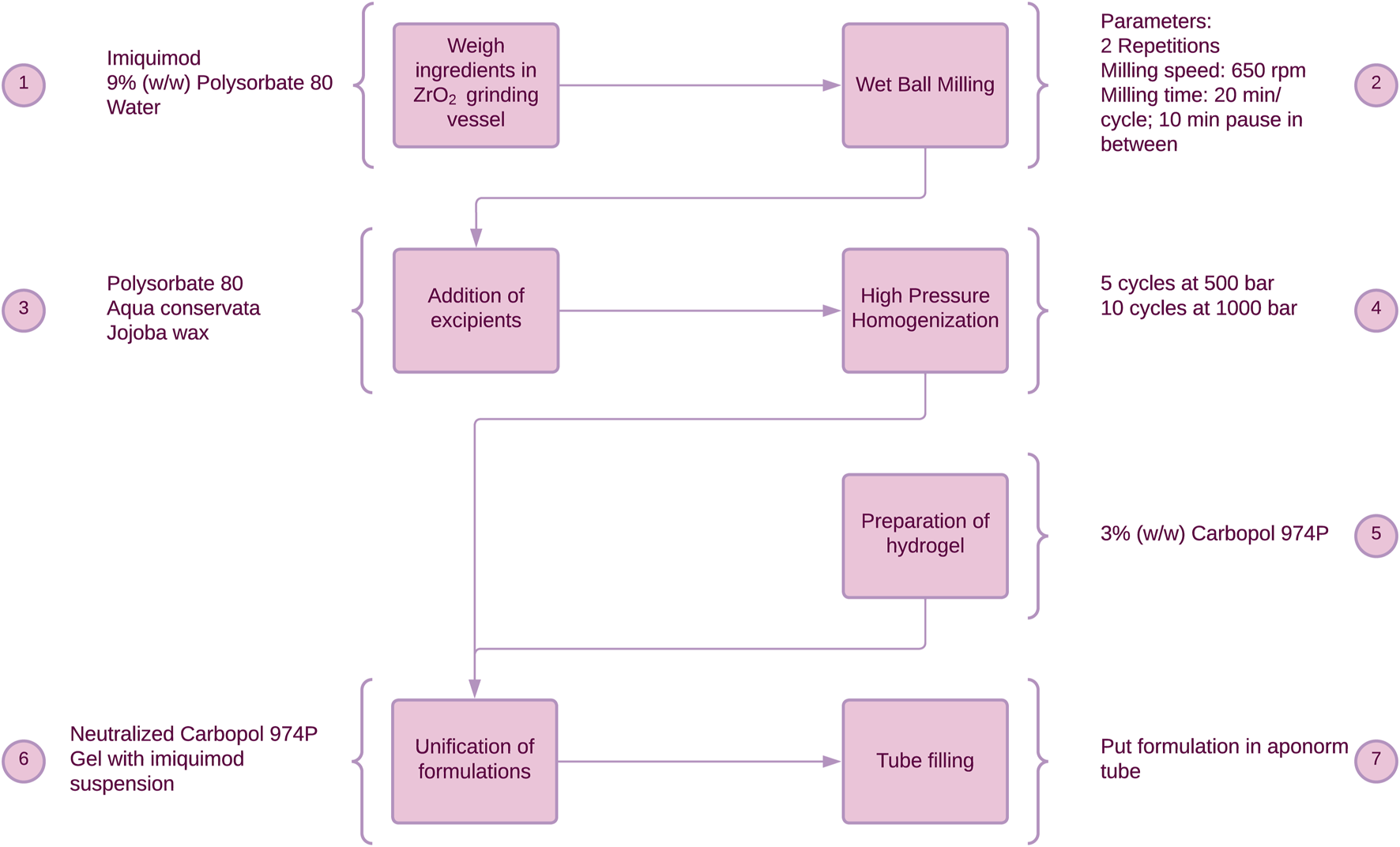 Manufacturing process of IMIGel. IMQ is being processed to nanocrystalline dimensions in the milling process (see step 2).