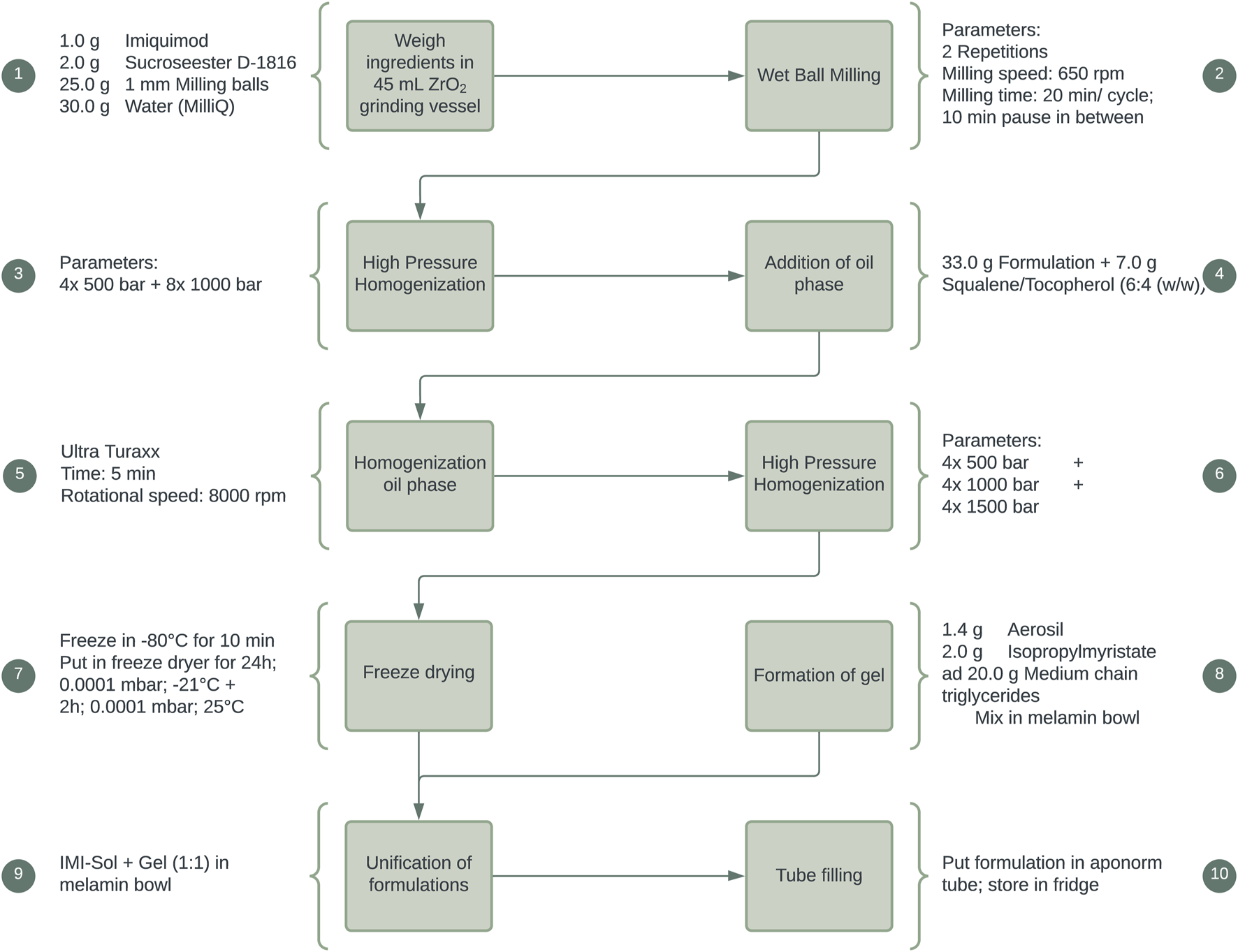 As a further progression, a solid nanoemulsion of IMQ, IMISol, was developed. This formulation incorporated several modifications, including replacing the previous oil phase consisting of jojoba wax with a mixture of squalene and tocopherol in a ratio of 6:4 (w/w). Additionally, a freeze-drying step was introduced, as illustrated in Figure 2. The development, the manufacturing process and special properties of the formulation have been described in previous work (Gogoll et al., 2016). To ease the application the two process steps 7 + 8 (Figure 2) were subsequently added, resulting in the formulation IMISol+, which was already used for further investigations (Hartmann et al., 2023). This formulation comprises the redispersion of the nanoemulsion containing nanocrystalline IMQ, along with an oleogel composed of aerosil, isopropyl myristate, and medium-chain triglycerides.