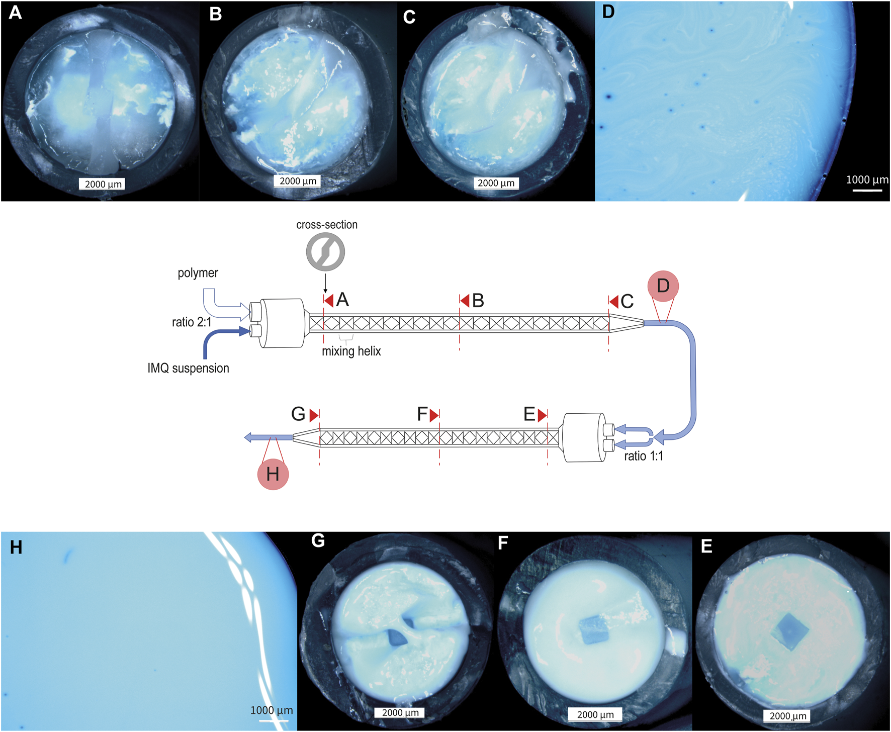 Stereomicroscopic pictures of nanocrystalline IMQ formulation with PVA 18–88 15% (w/w) (1:2) during the mixing process (dyed with methylene blue). (A) Cross-section of static mixer MBH 05-20T after the first mixing helix, illustrating the initial stage of the mixing process for the IMQ/PVA formulation; (B) Cross-section of static mixer MBH 05-20T after ten mixing helices, showcasing the intermediate stage of the first mixing step (C) Cross-section of static mixer MBH 05-20T after twenty mixing helices, representing the conclusion of the first mixing process (similarly mixed as in (D)); (E) Cross-section of static mixer MBH 06-20T after first mixing helix, illustrating the beginning of the second mixing step; (F) Cross-section of static mixer MBH 06-20T after ten mixing helices; (G) Cross-section of static mixer MBH 06-20T after twenty mixing helices, signifying the completion of the mixing process [similarly mixed as in (H)].
