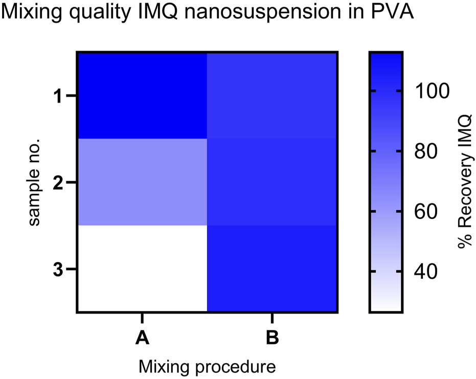 Comparison of IMQ content: Recovery in samples from mixing procedures (A, B) (n = 3) for the mixed formulation (IMQ nanocrystalline suspension: PVA 18-88 15% (w/w) (1:2)). Content assay conducted by HPLC. (Procedure A: Relative Standard Deviation (RSD) - 52.08%); Procedure B: RSD- 3.51%).