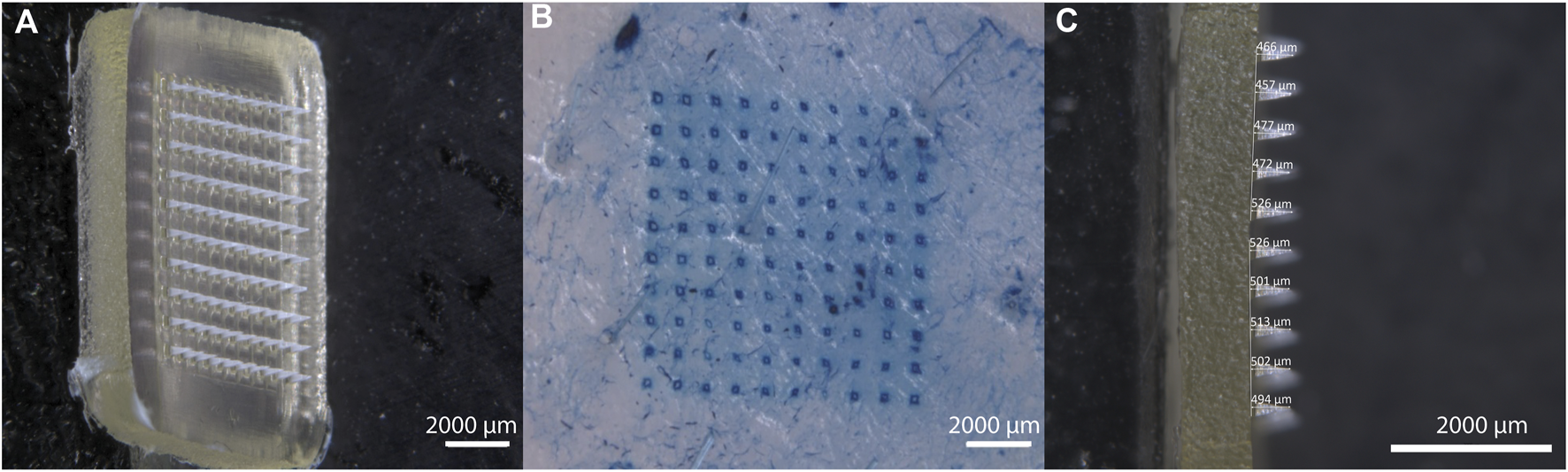 Characterization of IMQ-loaded MNA. (A) Stereomicroscopic image (z-stack) of IMQ-loaded MNA before insertion; (B) visualization of methylene blue-dyed porcine cadaver ear skin after MNA insertion and removal; (C) Lateral view of IMQ-loaded MNA (all Zeiss Discovery V12 stereomicroscope).