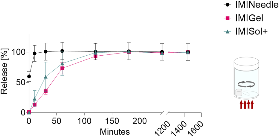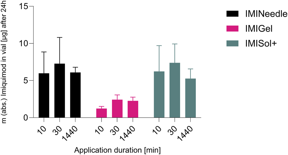 To investigate and compare the passive ex vivo diffusion of nanocrystalline IMQ in different formulations, Franz diffusion cells (EDC-07 Franz-diffusion-cell apparatus, Labswiss, Muttenz, Switzerland) respectively vertical diffusion cell (VDC) were utilized. Full-thickness porcine cadaver ear skin was chosen as the diffusion membrane, as it has been identified as a suitable model for human skin (Jacobi et al., 2007). VDCs with a receptor volume of 7.5 mL (excluding stirrer) were filled with degassed acetate buffer pH 3.7 (100 mM) (Donnelly et al., 2006) and maintained at a temperature of 32°C ± 1°C, following the USP specifications for semisolid drug products performance testing general chapter 〈1724〉 (The United States Pharmacopeia and National Formulary, 2018). Water-jacketed receptor cells connected to a thermostatically controlled water bath were employed to ensure temperature equilibration. Pretest equilibration was carried out for 30 min. After applying the membranes to the vials, magnetic stirrers were set at a speed of 700 rpm. The various formulations (IMINeedle, IMIGel, IMISol+) were applied to the skin samples. Duplicate measurements were conducted in each of the three experimental runs to ensure reliability. A line-up of the applied samples and the corresponding doses of IMQ is listed in Table 1. Sampling was carried out at specific time intervals, including 0, 10, 30, 60, 120, 180, 240, and 1,440 min. At each interval, 0.7 mL of receptor medium samples were simultaneously withdrawn from each VDC. To maintain consistency, the withdrawn sample volume was promptly replaced with a fresh, temperature-equilibrated receptor medium.