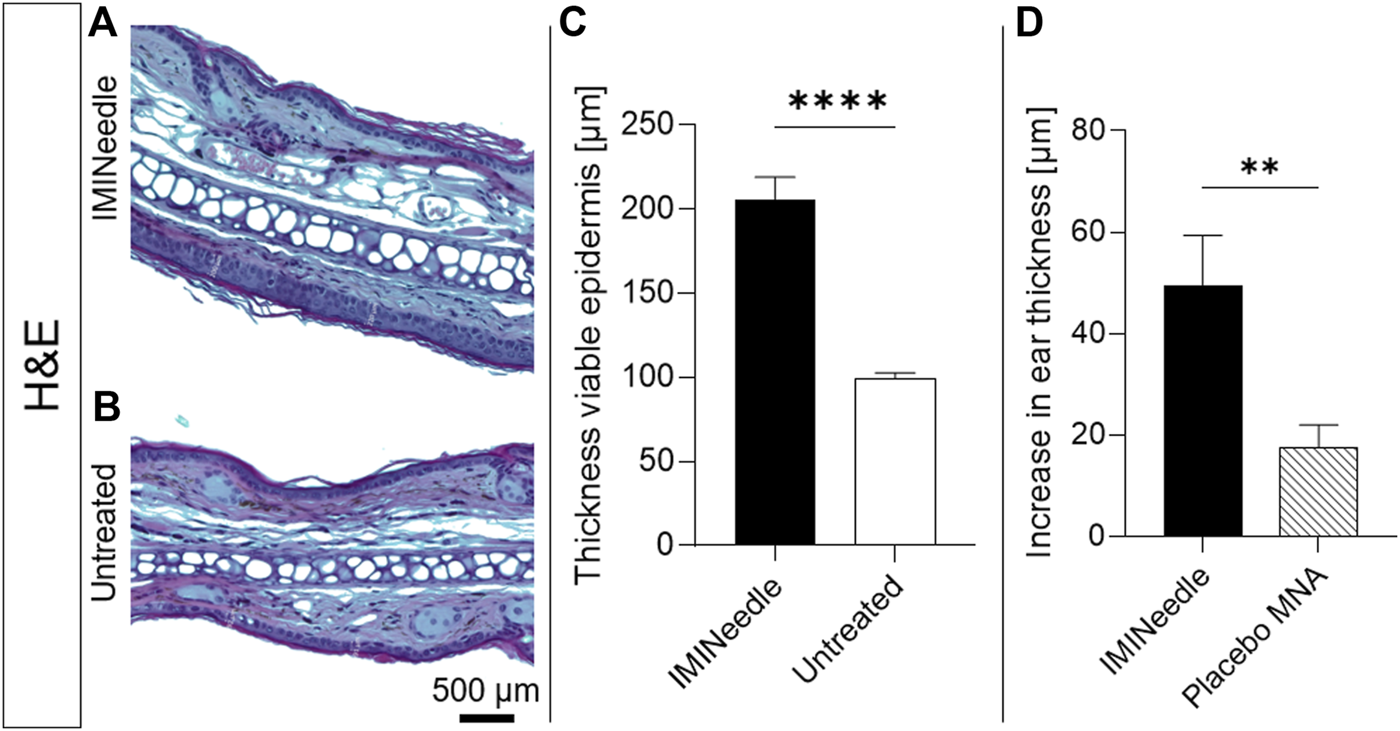 In vivo testing of the drug effect of IMQ was investigated using a murine model, in detail C57BL/6 mice. The experiments were reviewed and approved by the local authorities (Federal Investigation Office Rhineland-Palatinate, Koblenz, Germany, approval no. 23 177–07/G 22-1-097). As IMQ can induce psoriasis-like symptoms in murine models (Chuang et al., 2018), the effective administration of the MNA was confirmed by measuring the ear thickness and the increase in thickness of the viable epidermis in H&E-stained ear skin samples. Microneedles were manually applied to the mouse ears by thumb pressure for 30 s. The thickness of the total mouse ear was measured using a thickness gauge before and on day two after treatment administration. On day seven, the thickness of the viable epidermis was examined in H&E-stained ear skin sections using a Zeiss Discovery V12 stereomicroscope.