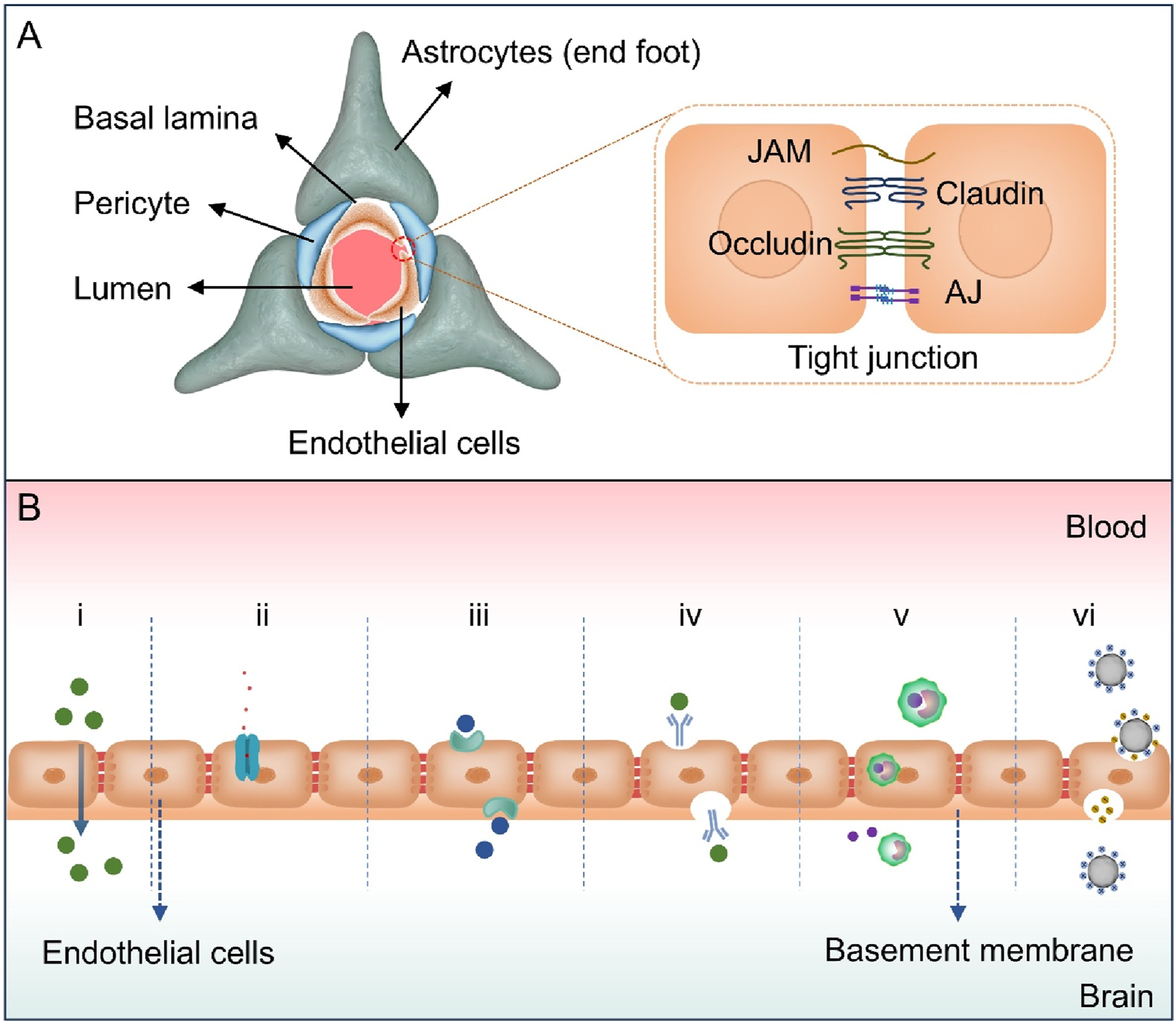 Figure 1. (A) The structure of the BBB. The BBB is mainly composed of brain microvascular endothelial cells, pericytes, astrocyte end feet, and basement membranes. Brain microvascular endothelial cells form a continuous barrier structure through tight junctions, which are composed of proteins such as Claudin, Occludin, junctional adhesion molecule (JAM) and adhesion junction (AJ), and restrict the free permeability of substances. (B) Diagram illustrating various mechanisms for crossing the BBB, including (i) passive diffusion (ii) efflux pumps, (iii) carrier-mediated transcytosis, (iv) receptor-mediated transcytosis, (v) cell-mediated transcytosis, and (vi) adsorptive-mediated transcytosis.