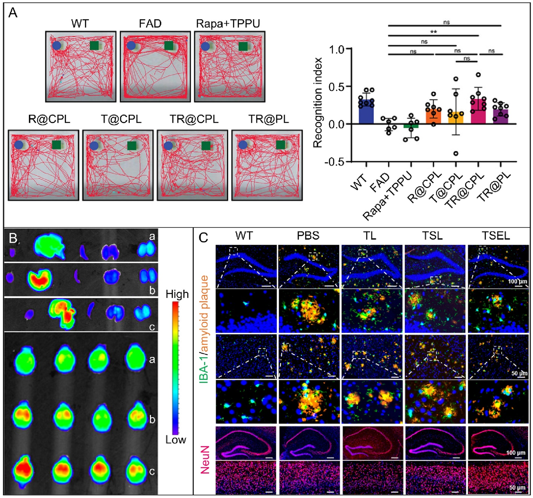 Figure 3. (A) A behavioral study on 5xFAD mice treated with different liposomes was conducted. The image shows representative trajectories of the seven groups in the NOR test and the recognition index (Lin et al., 2024). (n = 6–8, *p < 0.05, ***p < 0.001, ns p > 0.05). Copyright © 2024 The Authors. Advanced Science published by Wiley-VCH GmbH. (B) In vitro fluorescence imaging of the main organs (heart, liver, spleen, lung, kidney) and brain of FAD4T transgenic mice 6 h after oral administration of different fluorescent nanoparticles. (a) 28% PEG NPs, (b) 50% Man NPs, and (c) 50% Man NPs with Glu control (Lei et al., 2024). Copyright © 2024, American Chemical Society. (C) Immunofluorescence images of mouse hippocampus and cortex. Images show amyloid plaques (orange) and microglia (green) in the hippocampus and cortex, as well as NeuN (red) in the hippocampus of AD mice treated with PBS, TL, TSL, or TSEL. The bottom row of each image displays an enlarged view of the area indicated by the white box in the upper image (Jiang et al., 2024). Copyright © 2024, American Chemical Society.