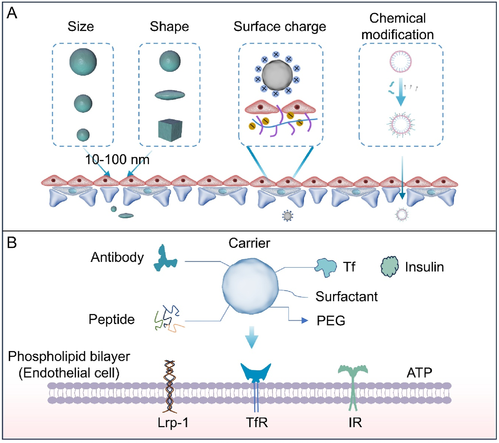 Figure 4. (A) The size, shape, chemical modification, and surface charge of nanoparticles all affect their ability to penetrate the BBB. Particles with small size, rod-shaped structures, lipophilic properties, or positive surface charge are conducive to crossing endothelial junctions. (B) Ligands include antibodies, transferrin, insulin, and peptides. Chemical groups include polyethylene glycol (PEG) and surfactants. These surface-functionalized groups promote the entry of carriers through the BBB and their absorption by the brain. Carriers modified with ligands can be recognized by cell surface receptors such as transferrin receptor (TfR), low-density lipoprotein receptor-related protein 1 (LRP-1), and insulin receptor (IR). This recognition promotes transcellular transport of the carriers, while chemical groups (e.g., PEG) enhance stability, prolong circulation time, or reduce non-specific interactions.