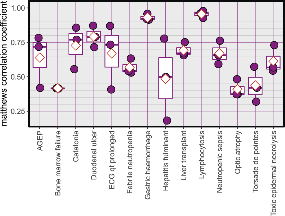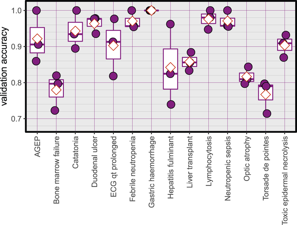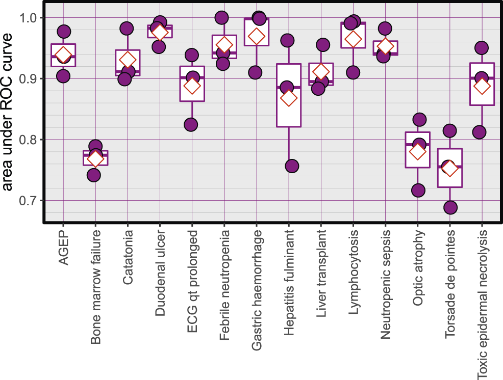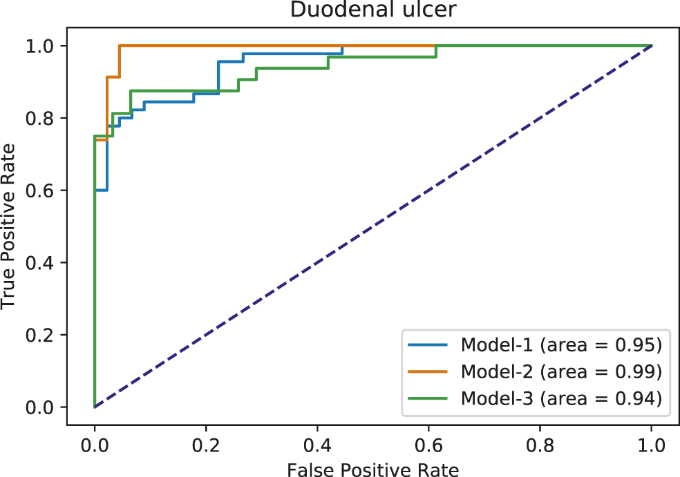 To highlight the effectiveness of our approach, we describe below our observations on the development of the duodenal ulcer ADR prediction model. Duodenal ulcer is a type of peptic ulcer disease characterized by the emergence of open sores on the duodenumās inner lining of the duodenum (Kuna et al., 2019). It is mainly caused by the failure of gastrointestinal system inner coating protection, and the most common causing agents are Helicobacter Pylori infection and NSAIDs (Non-steroidal anti-inflammatory drugs). It can lead to serious bleeding or perforation.