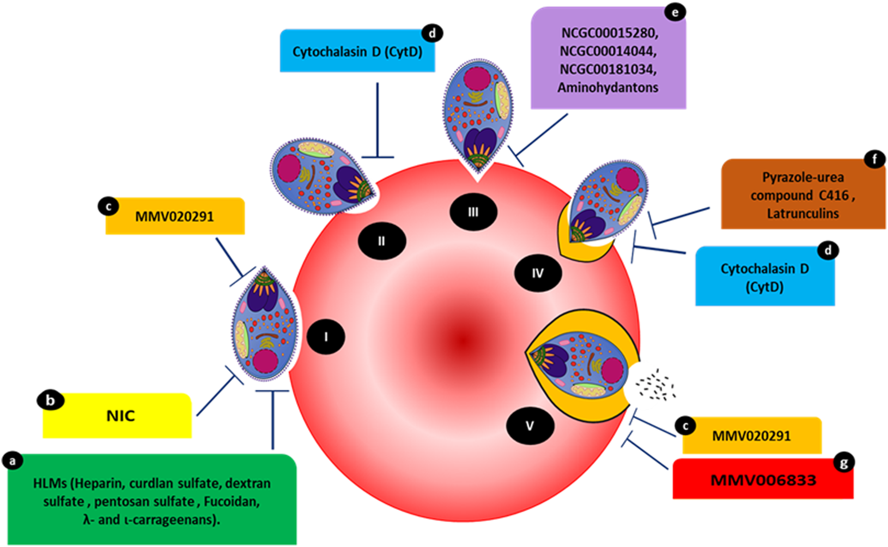 Compounds targeting various events occurring during the steps of host invasion. (I) Initial attachment. (II) Apical tip reorientation. (III) Tight junction formation. (IV) Internalization complemented with PVM formation. (V) Complete invasion. Compounds HLMs (a), NIC (b), and MMV020291 (c) reportedly inhibit membrane deformation. MMV02091 (c) also reportedly prolongs the echinocytosis duration of the RBC membrane. Cytochalasin D (cytD) (d) blocks the merozoite’s actin-myosin invasion motor and inhibits deformation. Three compounds, NCGC00015280 (e), NCGC00014044 (dimetacrine) (e), NCGC00181034 (liarozole hydrochloride) (e) and aminohydantons (e) inhibit junction formation. Pyrazole-urea compound C416 (f) reportedly targets the MyoA/MTIP interaction, while latrunculins (f) act against F-actin polymerization. MMV006833 (g) slows the invasion process and prevents echinocytosis recovery in RBCs.