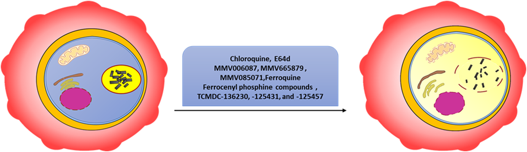 Phenotypes indicative of digestive vacuole compromise. Chloroquine, E64d, MMV006087, MMV665879, MMV085071, ferroquine, ferrocenyl phosphine compounds, TCMDC-136230, TCMDC-125431, and TCMDC-125457 reportedly affect DV integrity and induce programmed cell death-like features. The adjacent organelles (mitochondria, Golgi apparatus, endoplasmic reticulum, and nucleus) in the cytosol are assumed to be affected due to the leakage of DV contents.