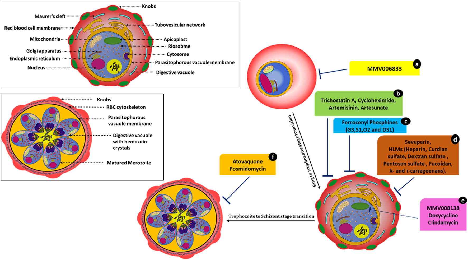 Molecules affecting parasite development and associated events. MMV006833 (a) prevents the development of ring-stage parasites. Trichostatin A (b), cycloheximide (b), artemisinin (b), and artesunate (b) actively disrupt ring-to-trophozoite transitions and arrest the parasites at the ring stage. Ferrocenyl phosphine compounds (c) G3, S1, O2, and DS1 inhibit trophozoite development and schizont maturation. Sevuparin (d) and HLMs (d) disrupt the rosetting and sequestration of infected RBCs. Compounds MMV008138 (e), doxycycline (e), and clindamycin (e) cause apicoplast developmental arrest. Atovaquone (f) and fosmidomycin (f) cause incomplete schizont development.