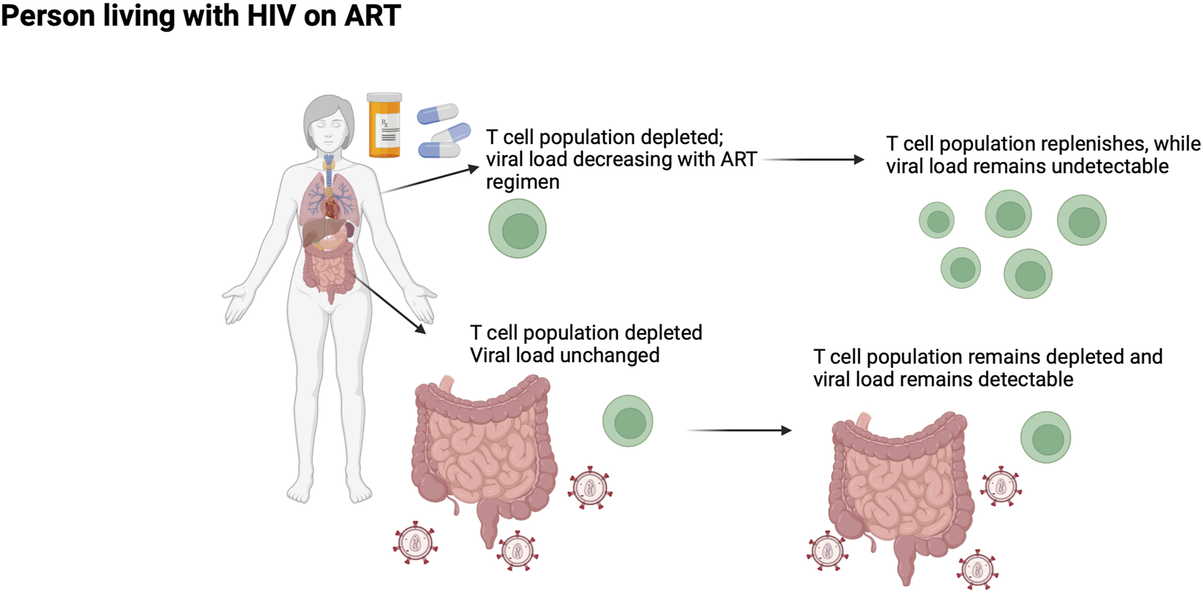 Existing research and standard HIV-tracking practices focus on peripheral blood, which contains only 2 to 5 percent of the body’s lymphocytes. In contrast, gut-associated lymphoid tissue (GALT) houses over 80 percent of lymphocytes. Biopsies from intestinal tissues can still be readily collected, further highlighting the need to shift attention toward GALT for monitoring of PWH. Viruses have been found to accumulate in GALT, making it a hotspot for sudden infection, and thus immune activation. Primary HIV-1 infection significantly diminished concentrations of CD4+ and CD4+CD8 T-cell concentrations in GALT but not in peripheral blood. In one study, participants lost 60 percent of their CD4+ T cells of GALT within 3 weeks of infection. These low cellular counts did not rebound following ART with levels remaining lower in GALT compared to peripheral blood (Figure 1). CD4+ T cells vulnerability to HIV infections stems from their expression of CCR5, a receptor to which HIV is reactive. Depleted CD4+ T cell concentration in GALT compared to peripheral blood persisted in asymptomatic PWH. Primary HIV-1 infection also spiked cell proliferation rates in GALT, pointing to the tissue’s relevance in HIV infection. Furthermore, CD4+ T cell levels in peripheral blood returned to normal following viral suppression. This rebound in cellular concentration was not evident in GALT for people with chronic infection, albeit it was evident in people who received ART early in infection (Guadalupe et al., 2003; Mehandru et al., 2006; Costiniuk and Angel, 2012).