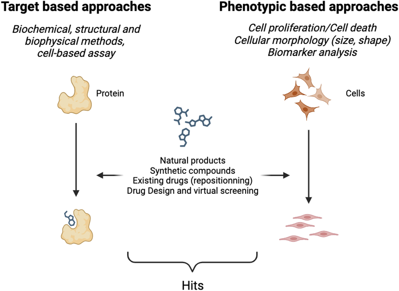 To identify new hits, a screening strategy (or method) must be adopted. A set of specific assays must be carried out to identify and optimize potential drugs that then become drug candidates for clinical trials. Two major kinds of approaches exist (Figure 1), namely, those that require the identification of a target and validation of the relationship between that target and a particular disease–called target-based approaches–and those that work in a target agnostic fashion known as phenotypic approaches. The latter consist in observing the effect(s) of a new potential therapy at the level of cells or whole organisms. Phenotypic approaches require an experimental model as close as possible of the pathology and symptoms observed in human.