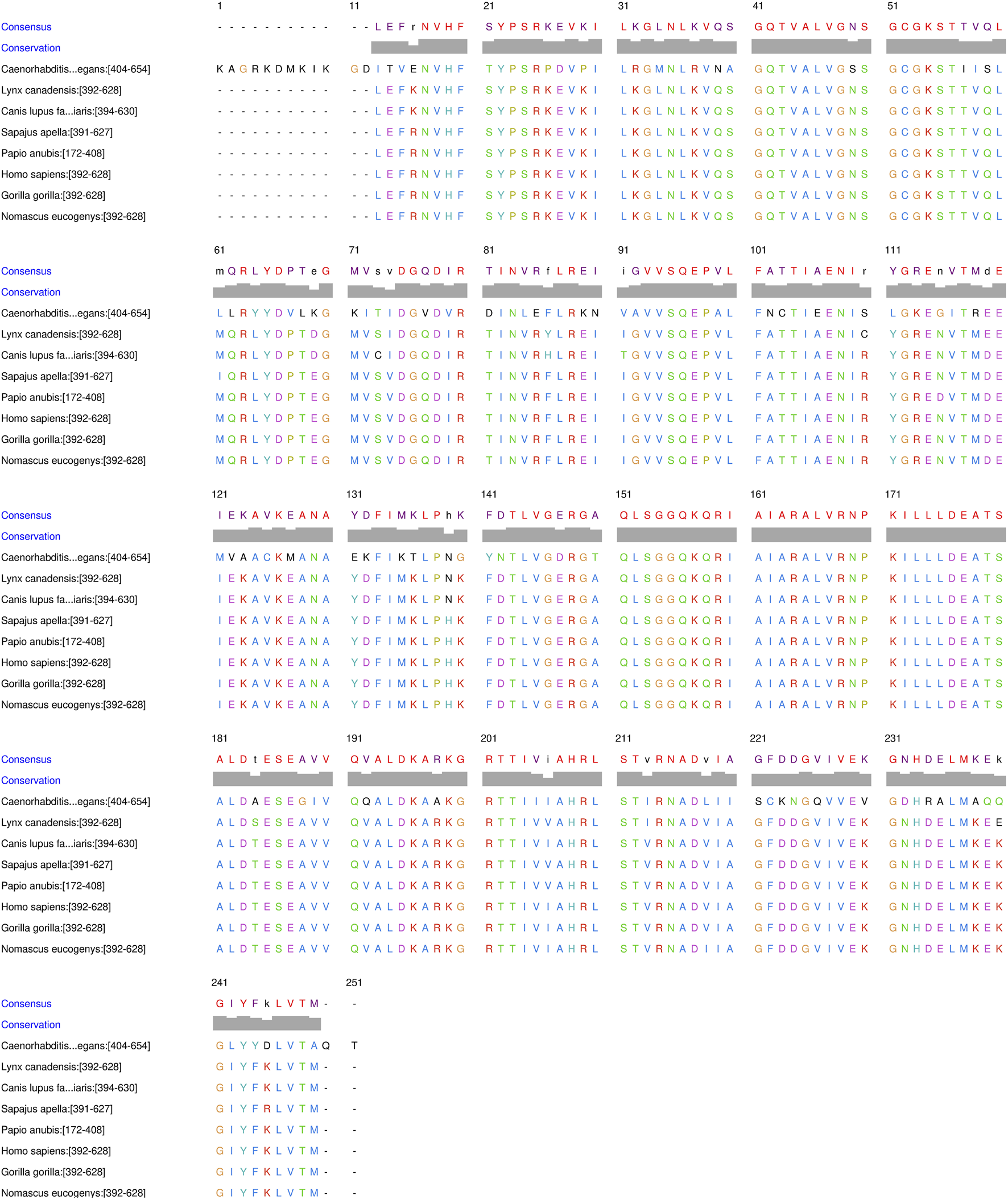 Multiple sequence alignment of Nucleotide Binding Domains (NBDs) of different organisms: Homo sapiens (P08183), Gorilla gorilla (G3S959), Nomascus leucogenys (A0A2I3GNI3), Sapajus apella (A0A6J3FUE0), Canis lupus familiaris (A0A5F4BVH2) and Lynx canadensis (A0A667GS53), showing high dissimilarities among them.