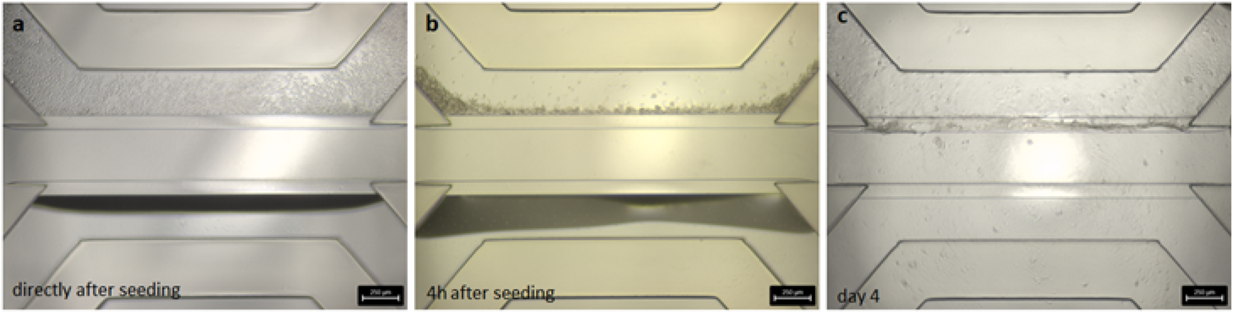 Cells were trypsinized using Trypsin-EDTA solution (Sigma-Aldrich, T3924) and resuspended at 10,000 cells per µl prior to seeding. The cells were applied to 3-lane OrganoPlates (Mimetas, 4004-400-B). Prior to cell seeding, 1.7 µL of a gel composed of 1 M Hepes (Gibco, 15630-080), 37 g/L NaHCO3 (Sigma, S5761), and 4 mg/mL Collagen I (R&D System, 3447-020-01) in a 1:1:8 ratio was added in the gel inlet and incubated for 15 min at 37°C. After polymerization, 50 µL HBSS (Cytiva, SH30268.01) was dispensed in the gel inlet channels to avoid dehydration of the gel. The cells were applied by seeding 2 µL of 1 × 107 cells/mL cell suspension in the inlet of the top channel. Subsequently, 50 µL of medium was added to the same well. Afterward, the OrganoPlate was placed on its side on a specific plate stand for 4 h at 37°C to allow the cells to settle against the ECM. This was followed by adding an additional 50 µL medium to the outlets of the top channel and to the inlets and outlets of the bottom channel. Next, the OrganoPlate was placed horizontally in an incubator (37°C and 5% CO2) on an interval rocker (OrganoFlow, Mimetas), which switches the inclination between +7° and −7° every 8 min and allows a bidirectional flow of the medium. Every 2–3 days, the medium was refreshed.