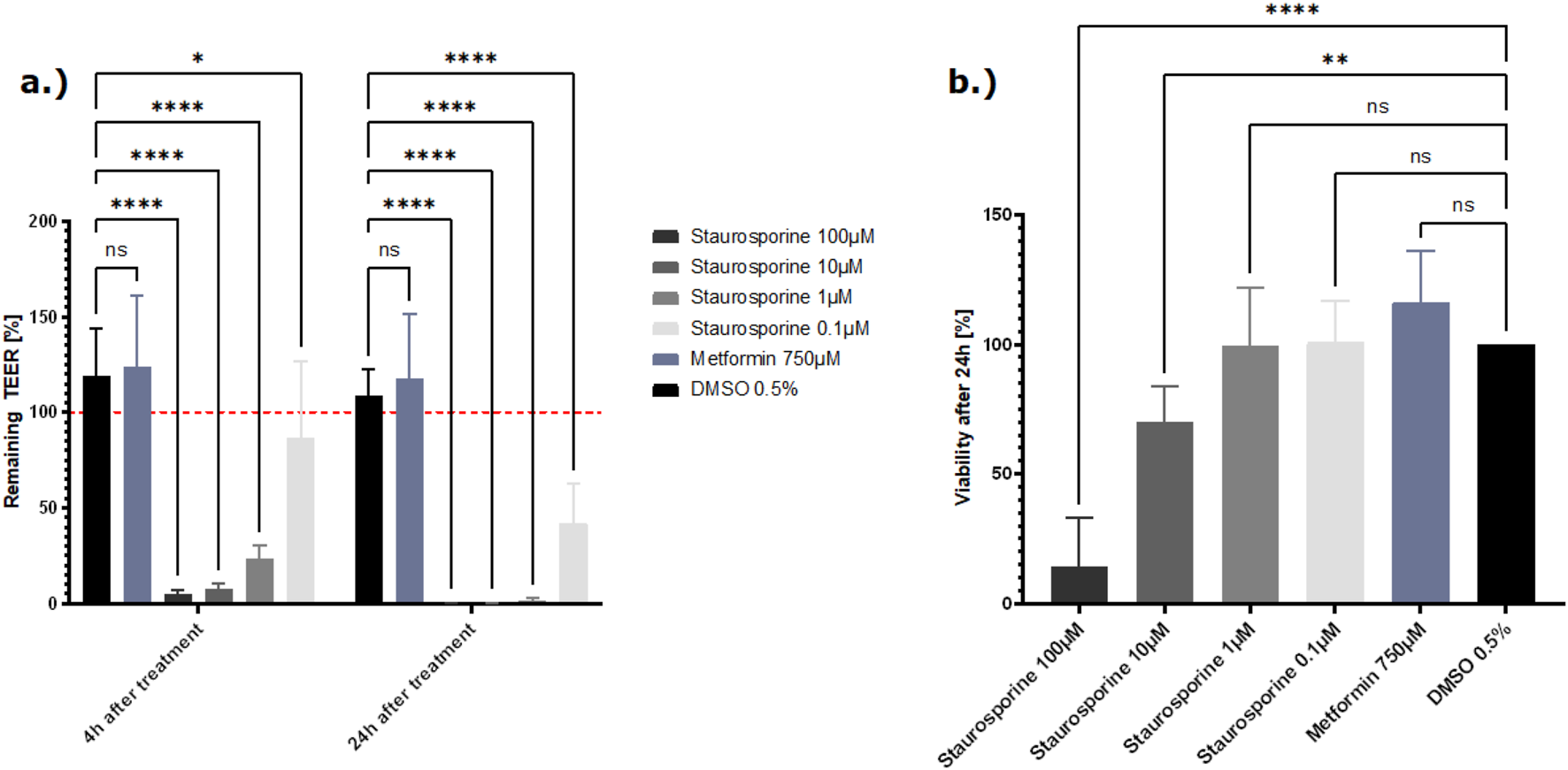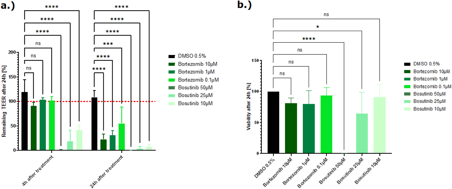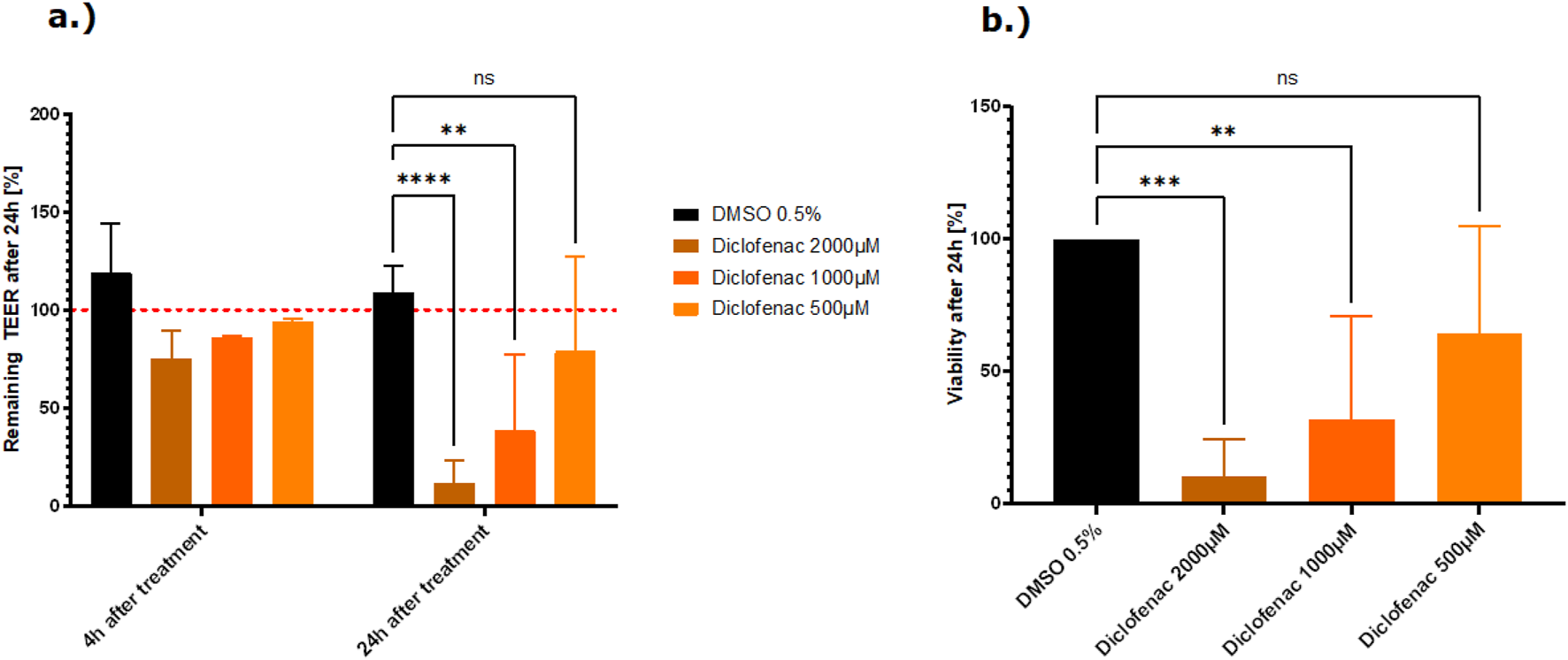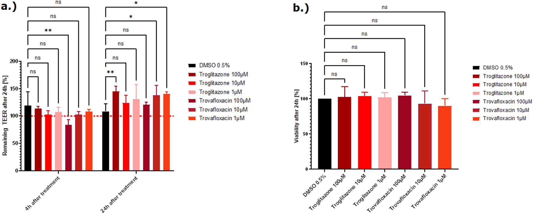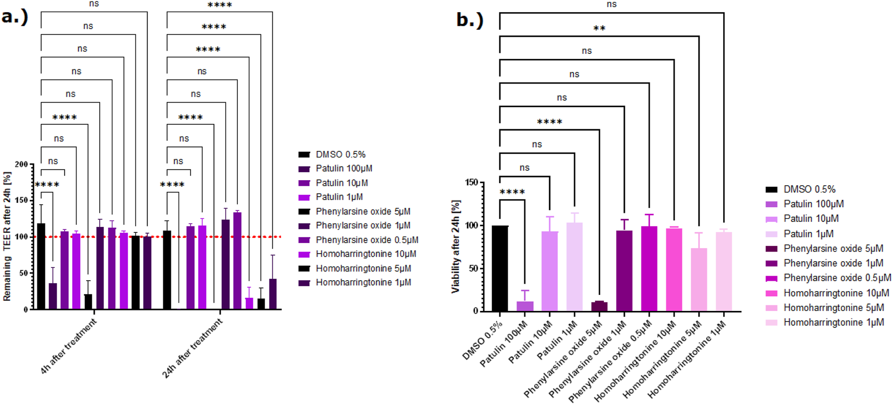 The TEER values were measured 4Â h and 24Â h after treatment. In parallel the cell viability was determined after 24Â h to be able to distinguish between an unspecific cytotoxic effect or direct tight junction damage. Overall, from the 23 tested compounds, 15 showed the expected outcome, i.e., the compound led to a decrease of the TEER for the positive control compounds, or the TEER value remained stable after treatment with non-GI-toxic compounds.