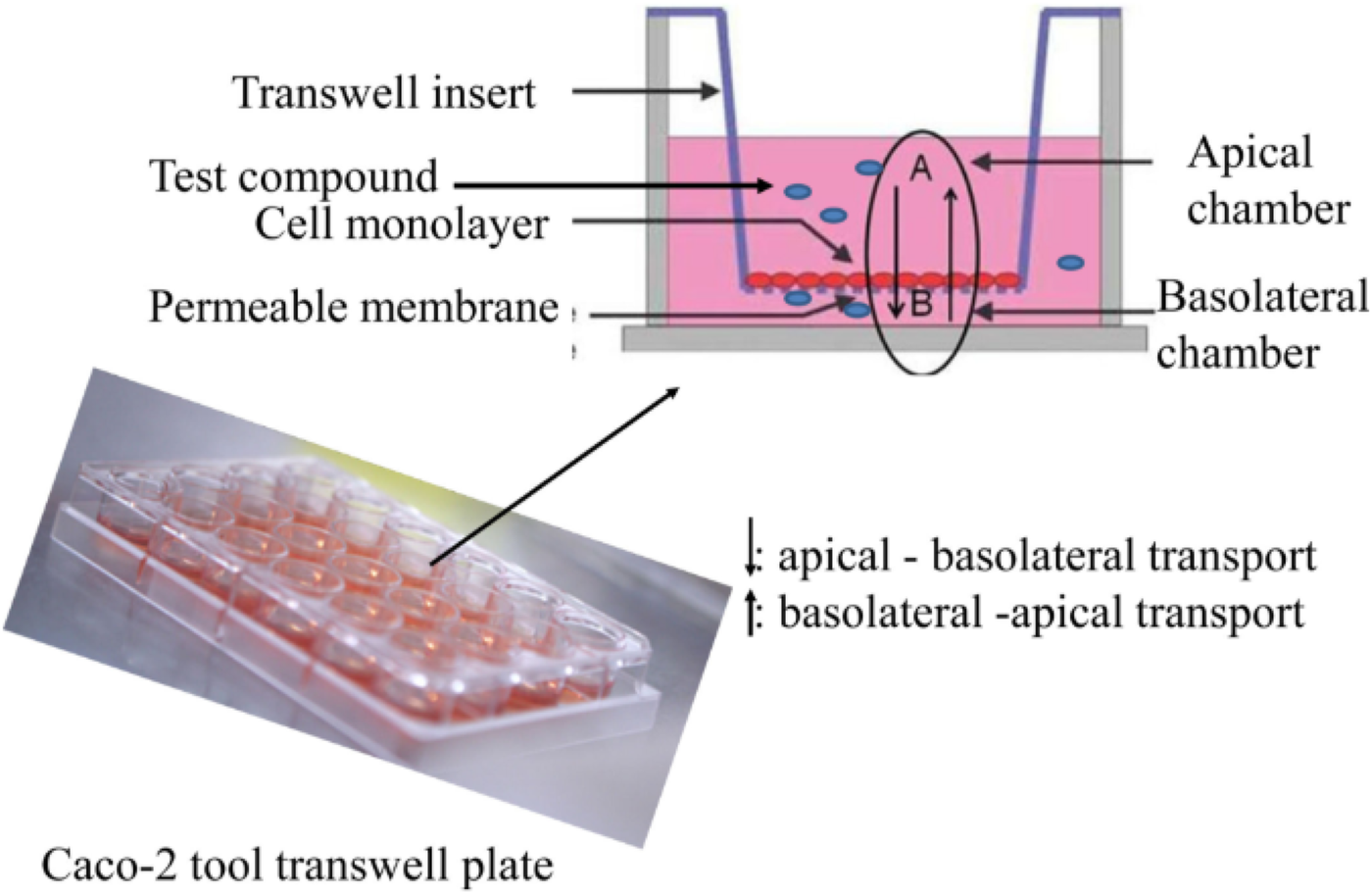 A classical and widely used method is the measurement of the TEER of a 2D cell monolayer of Caco-2 cells cultured on semipermeable membranes. Caco-2 cells are originally from a human colon adenocarcinoma but express functional and morphological characteristics of differentiated small intestinal enterocytes. They form confluent layers with highly polarized cells, joined via tight junctions, including apical and basolateral sides, with microvilli on the apical membrane (Sambuy et al., 2005). The full differentiation of Caco-2 cells takes approximately 14–21 days on Transwell inserts and reaches TEER values of 150–400 Ω (Srinivasan et al., 2015).