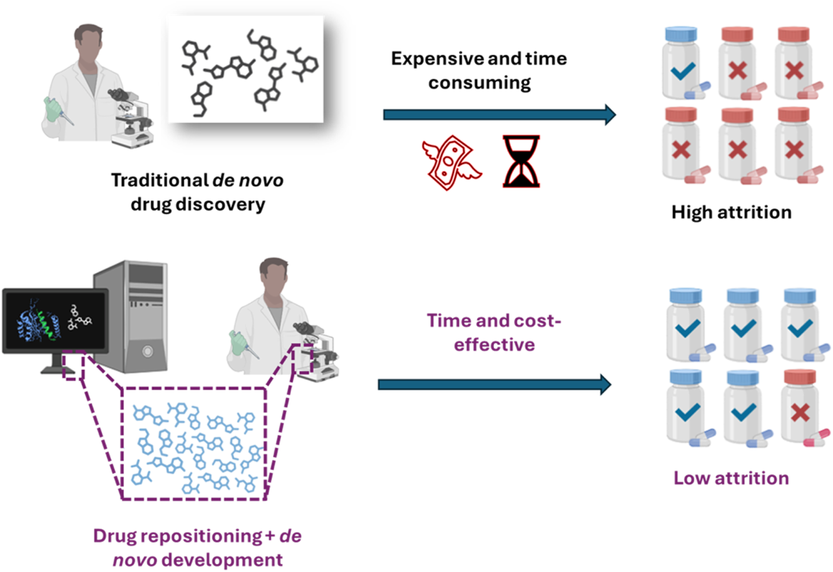 The integrated approach of drug repurposing and traditional de novo drug development increases the cost-effectiveness of the whole drug discovery process, by assuring lower attrition rates and saving time.