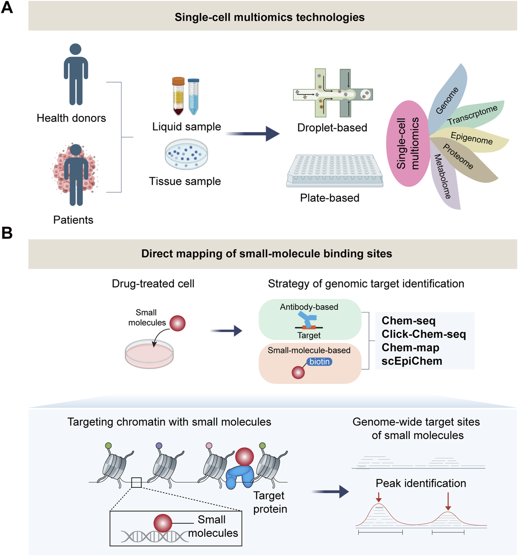 Single-cell multi-omics technologies for mapping drug-target binding. (A) The strategy of single-cell multiomics for studying complex diseases. (B) Single-cell multiomics for direct mapping of small-molecule binding sites in drug response. Cutting-edge technolo- gies achieve genome-wide mapping of small molecule target sites at bulk (Chem-seq, Click-Chem-map, Chem-map) even single-cell level (scEpiChem).