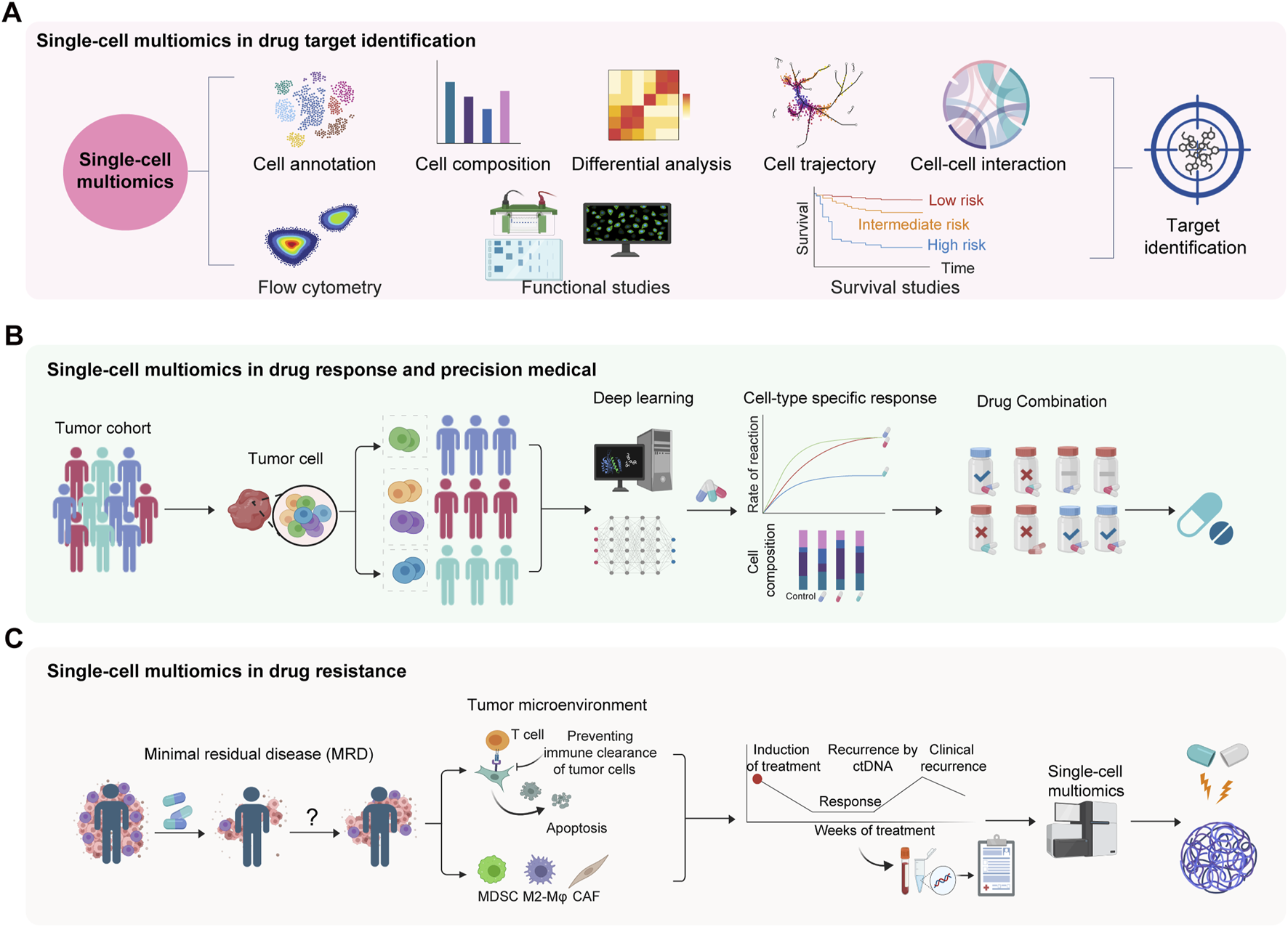 Applications of single-cell multi-omics in drug target identification, and deciphering of drug response and resistance. (A) Single-cell multiomics for target identification in complex diseases. (B) Single-cell multiomics in drug response and precision medical. (C) Single-cell multiomics in drug resistance. Minimal residual disease (MRD) might be capable of reinitiating tumors and causing recurrence. MDSC, myeloid-derived suppressor cell. CAF, cancer associated fibroblast.