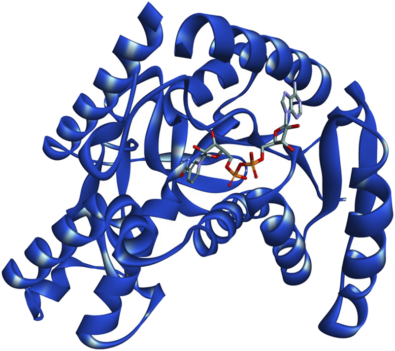 3D structure of PfLDH complexed with co-factor NADH (PDB ID:1T2C). The protein backbone is represented as a ribbon diagram, with NADH shown in stick representation.